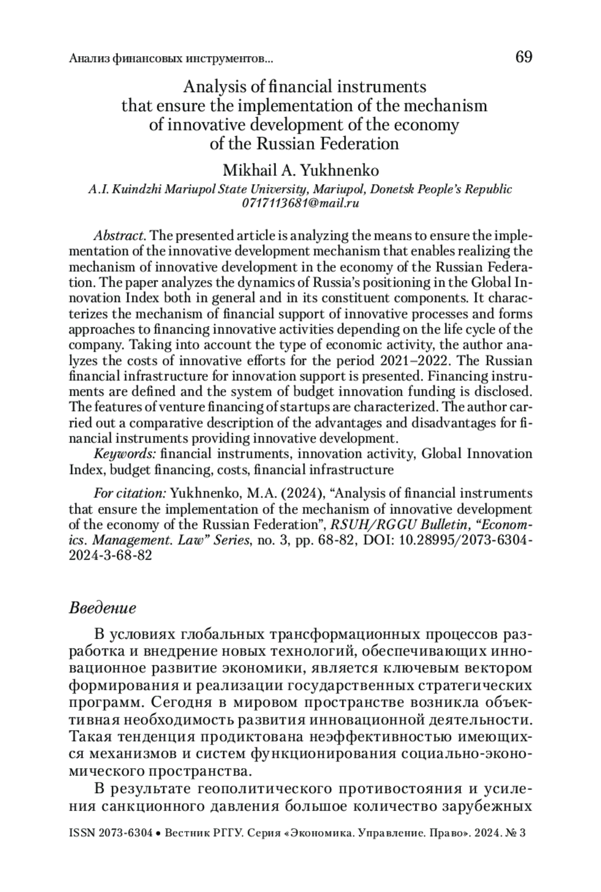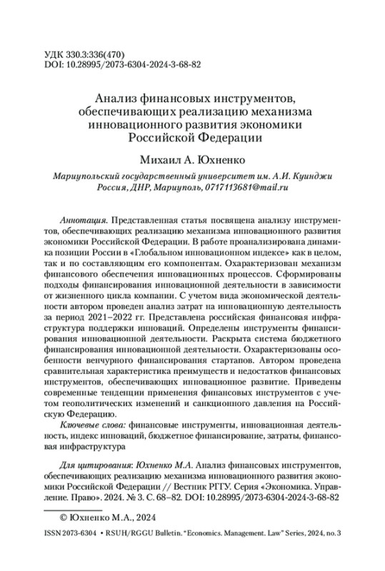 Представленная статья посвящена анализу инструментов, обеспечивающих реализацию механизма инновационного развития экономики Российской Федерации. В работе проанализирована динамика позиции России в «Глобальном инновационном индексе» как в целом, так и по составляющим его компонентам. Охарактеризован механизм финансового обеспечения инновационных процессов. Сформированы подходы финансирования инновационной деятельности в зависимости от жизненного цикла компании. С учетом вида экономической деятельности автором проведен анализ затрат на инновационную деятельность за период 2021–2022 гг. Представлена российская финансовая инфраструктура поддержки инноваций. Определены инструменты финансирования инновационной деятельности. Раскрыта система бюджетного финансирования инновационной деятельности. Охарактеризованы особенности венчурного финансирования стартапов. Автором проведена сравнительная характеристика преимуществ и недостатков финансовых инструментов, обеспечивающих инновационное развитие. Приведены современные тенденции применения финансовых инструментов с учетом геополитических изменений и санкционного давления на Российскую Федерацию.