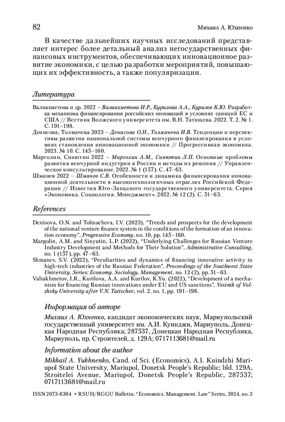2. Денисова, Толмачева 2023 - Денисова О.Н., Толмачева И.В. Тенденции и перспективы развития национальной системы венчурного финансирования в условиях становления инновационной экономики // Прогрессивная экономика. 2023. № 10. С. 145-160.