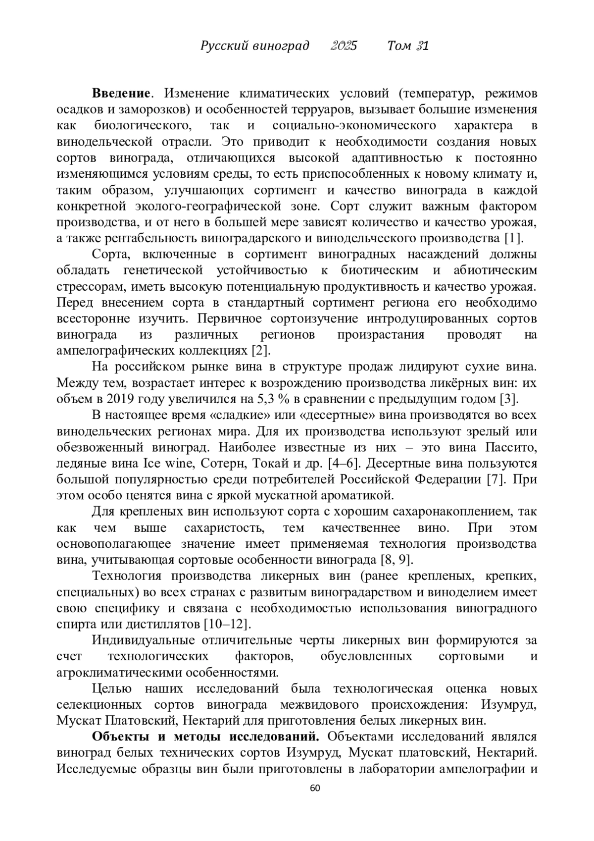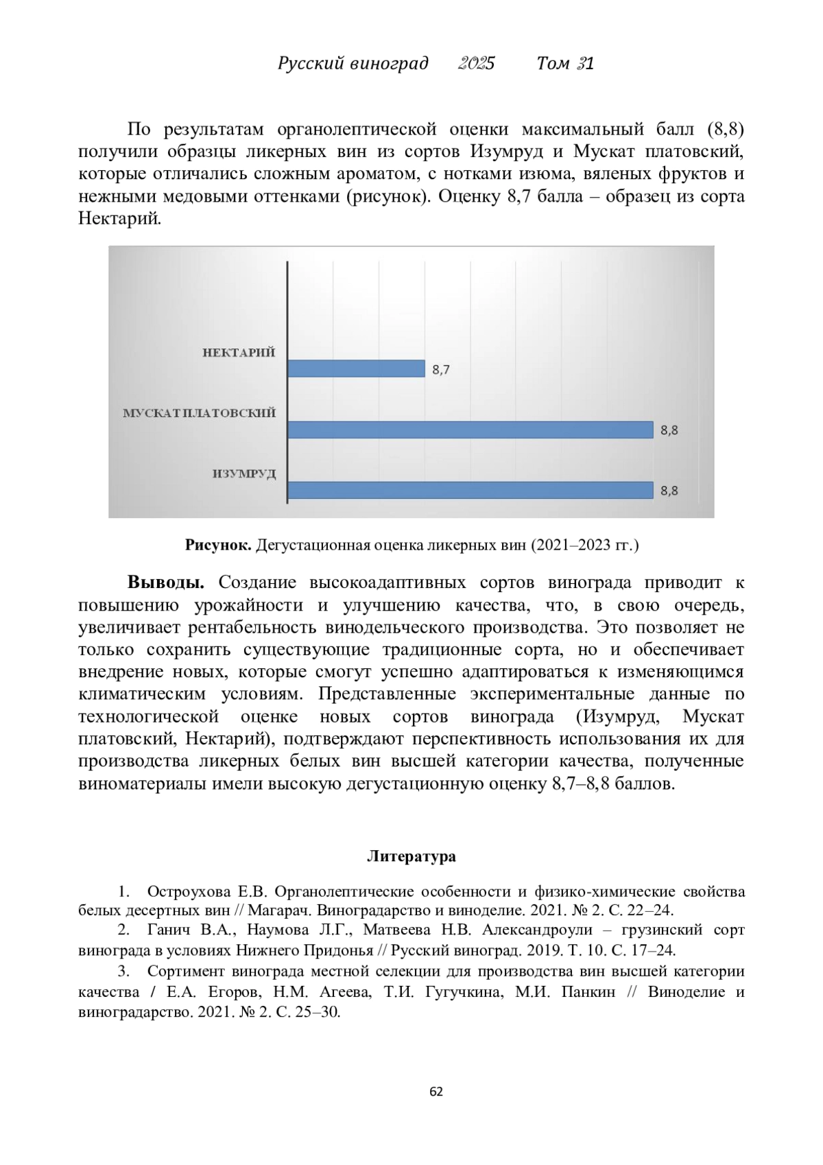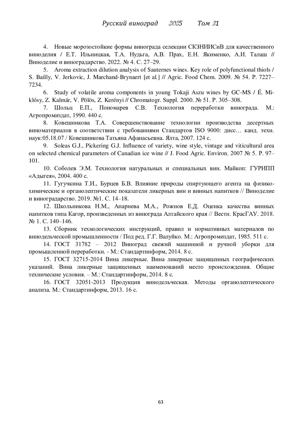 1. Остроухова Е.В. Органолептические особенности и физико-химические свойства белых десертных вин // Магарач. Виноградарство и виноделие. 2021. № 2. С. 22–24.