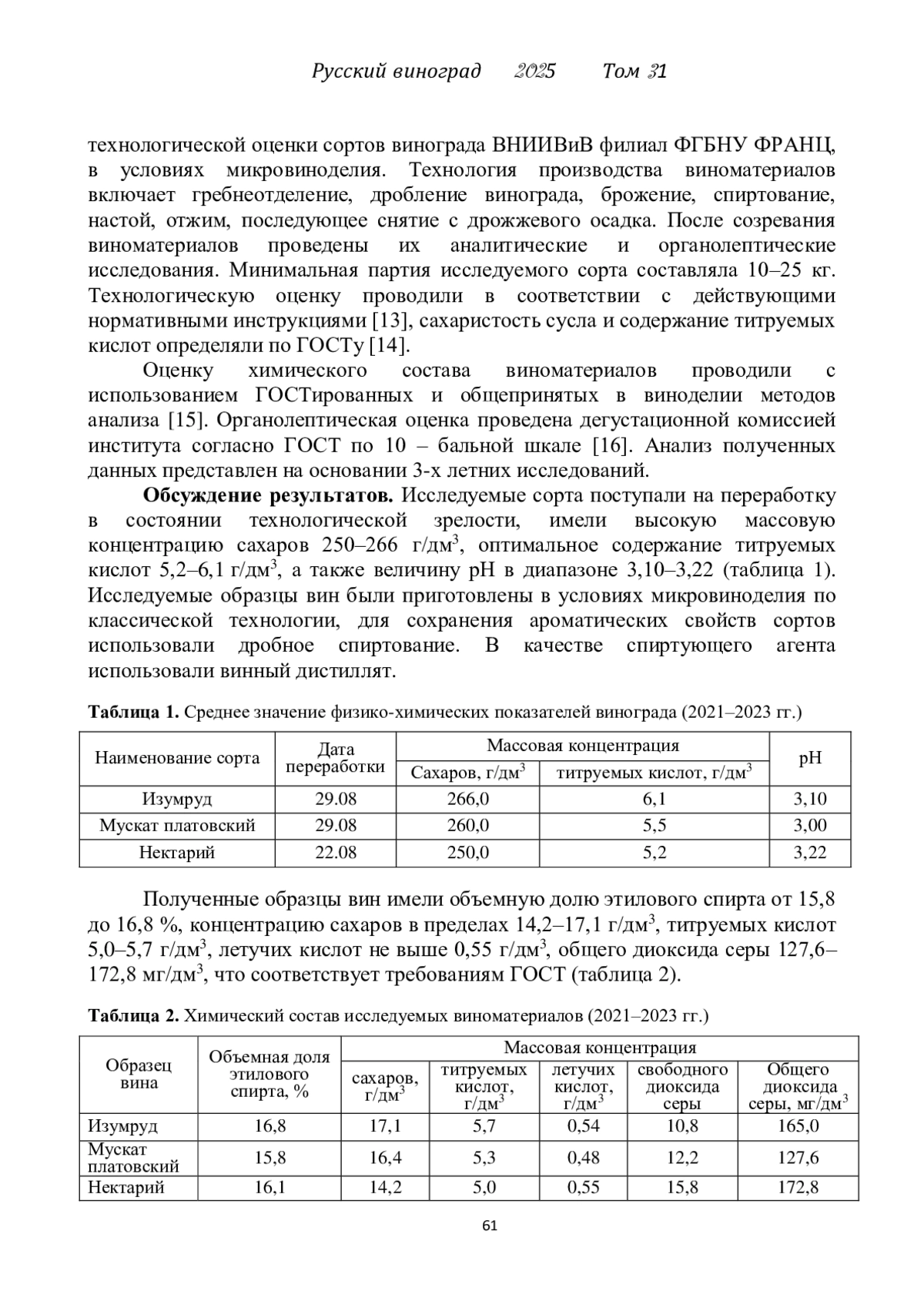 3. Сортимент винограда местной селекции для производства вин высшей категории качества / Е.А. Егоров, Н.М. Агеева, Т.И. Гугучкина, М.И. Панкин // Виноделие и виноградарство. 2021. № 2. С. 25–30.