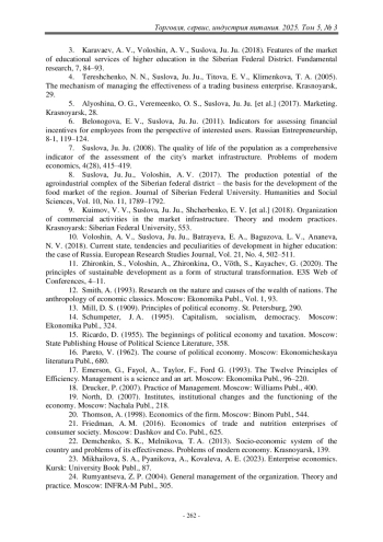 8. 	Suslova, Ju. Ju. The production potential of the agroindustrial complex of the siberian federal district - the basis for the development of the food market of the region [Текст] / Ju. Ju. Suslova, A. V. Voloshin // Journal of Siberian Federal University. Humanities and Social Sciences. - 2017. - Vol. 10, No. 11. - Pp. 1789-1792.