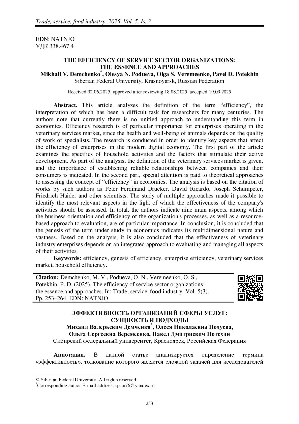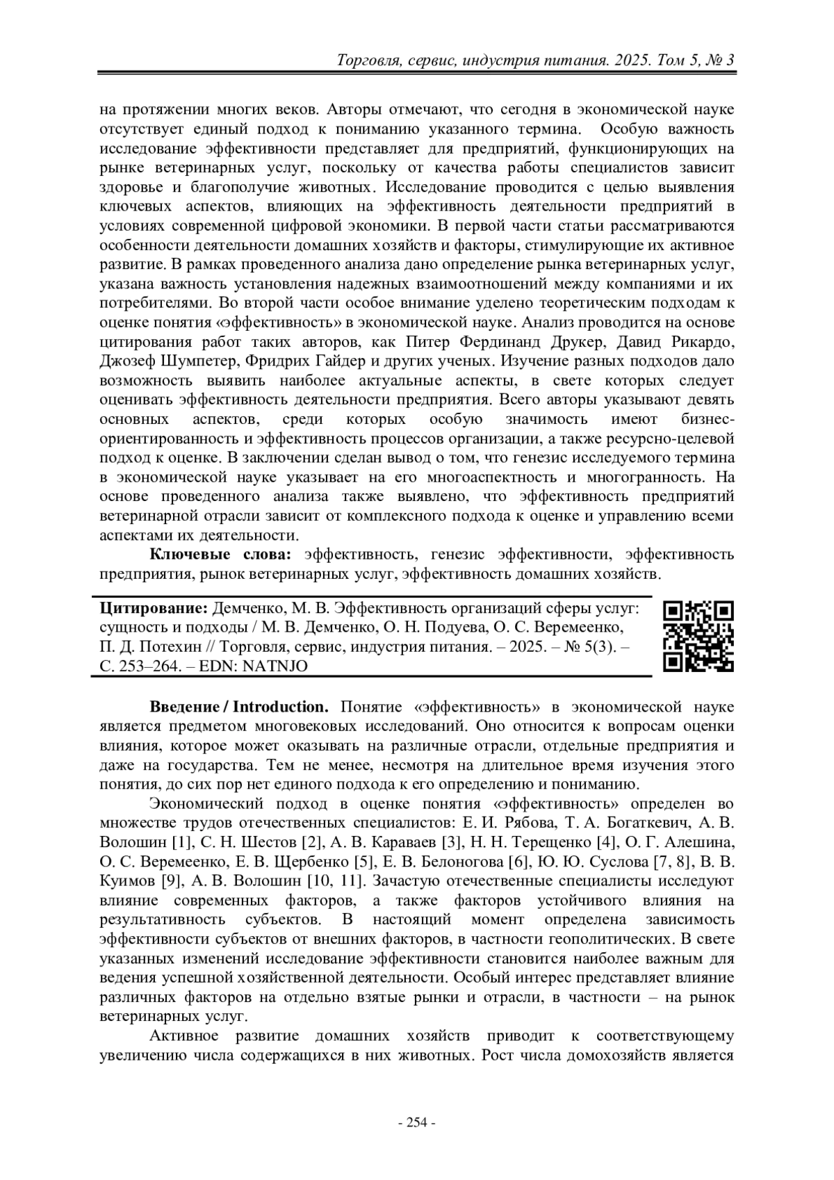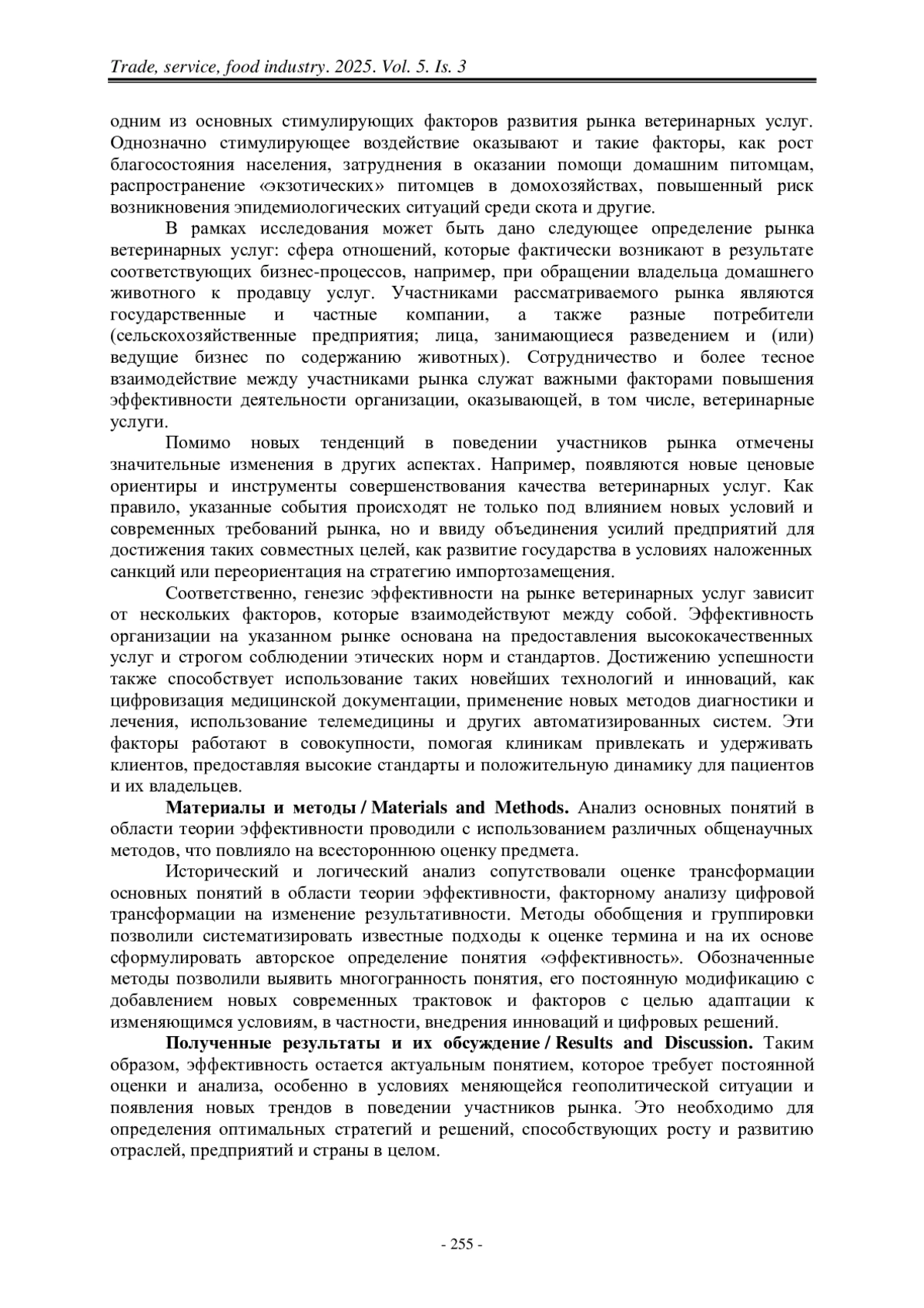 В данной статье анализируется определение термина «эффективность», толкование которого является сложной задачей для исследователей на протяжении многих веков. Авторы отмечают, что сегодня в экономической науке отсутствует единый подход к пониманию указанного термина. Особую важность исследование эффективности представляет для предприятий, функционирующих на рынке ветеринарных услуг, поскольку от качества работы специалистов зависит здоровье и благополучие животных. Исследование проводится с целью выявления ключевых аспектов, влияющих на эффективность деятельности предприятий в условиях современной цифровой экономики. В первой части статьи рассматриваются особенности деятельности домашних хозяйств и факторы, стимулирующие их активное развитие. В рамках проведенного анализа дано определение рынка ветеринарных услуг, указана важность установления надежных взаимоотношений между компаниями и их потребителями. Во второй части особое внимание уделено теоретическим подходам к оценке понятия «эффективность» в экономической науке. Анализ проводится на основе цитирования работ таких авторов, как Питер Фердинанд Друкер, Давид Рикардо, Джозеф Шумпетер, Фридрих Гайдер и других ученых. Изучение разных подходов дало возможность выявить наиболее актуальные аспекты, в свете которых следует оценивать эффективность деятельности предприятия. Всего авторы указывают девять основных аспектов, среди которых особую значимость имеют бизнесориентированность и эффективность процессов организации, а также ресурсно-целевой подход к оценке. В заключении сделан вывод о том, что генезис исследуемого термина в экономической науке указывает на его многоаспектность и многогранность. На основе проведенного анализа также выявлено, что эффективность предприятий ветеринарной отрасли зависит от комплексного подхода к оценке и управлению всеми аспектами их деятельности.