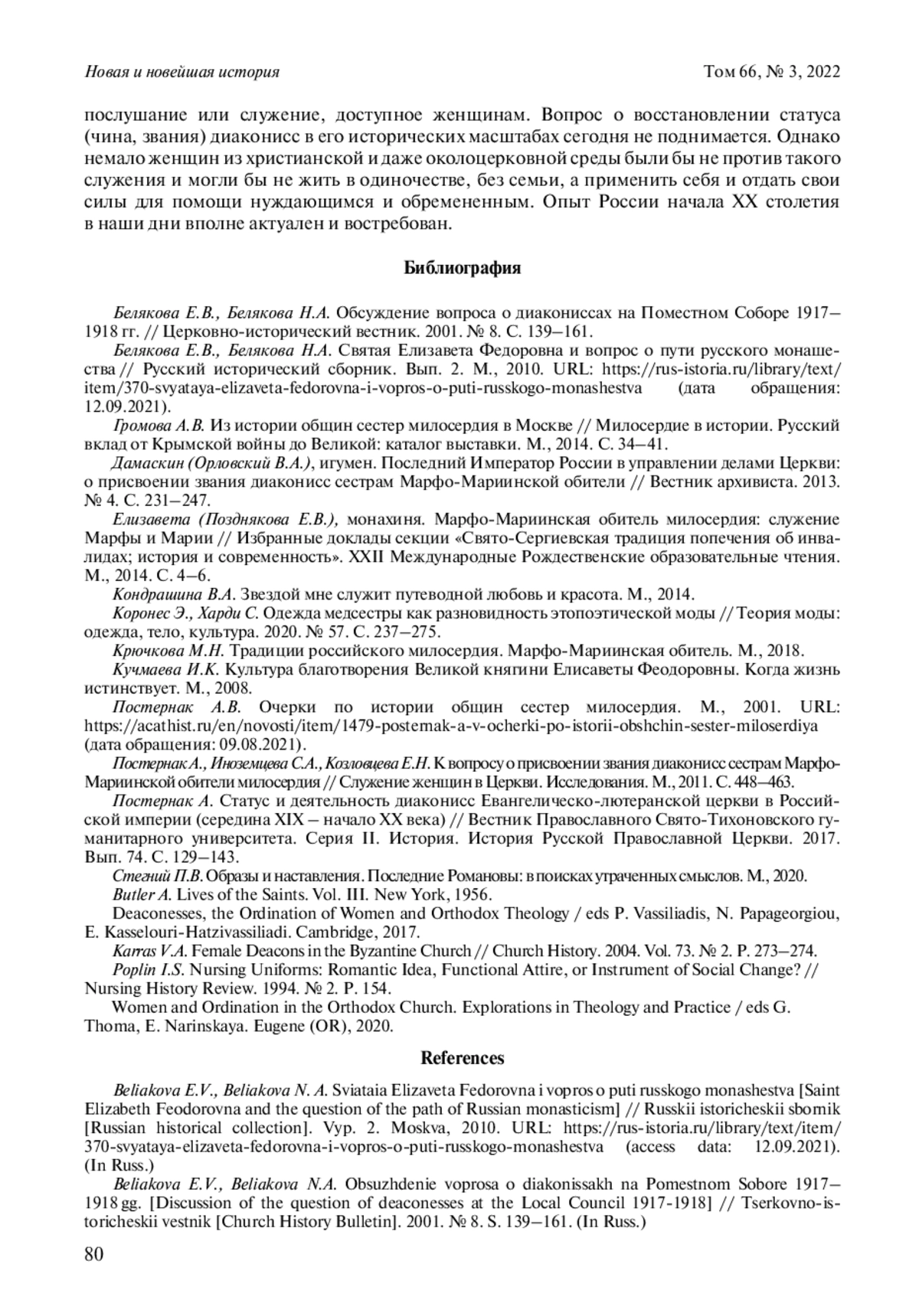 1. 	Белякова Е.В., Белякова Н.А. Обсуждение вопроса о диакониссах на Поместном Соборе 1917-1918 гг. // Церковно-исторический вестник. 2001. № 8. С. 139-161. EDN: TGYTFL