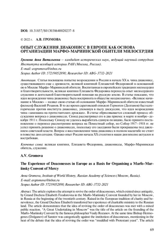 Статья посвящена попытке возрождения в России в начале ХХ в. чина диаконисс, существовавшего еще с древности, великой княгиней Елизаветой Федоровной в основанной ею в Москве Марфо-Мариинской обители. Воспитанная в европейских традициях милосердия и благотворительности, великая княгиня Елизавета Федоровна перенесла опыт милосердного служения и деятельной благотворительной помощи на русскую землю. В статье показано, что идея возрождения чина диаконисс была воспринята в обществе неоднозначно. «Великое начинание в Москве» – назвал свою статью об основании Марфо-Мариинской обители известный философ Василий Розанов. В то же время саратовский епископ Гермоген (Долганов) был категорически против института диаконисс, упомянув в пылу дискуссии, что идея возрождения чина «замешана на протестантских дрожжах». В статье обрисовывается сложный процесс обсуждения вопроса о диакониссах. Синод рассматривал его в два приема: в марте и ноябре–декабре 1911 г. Поскольку Синоду не удалось выработать единую позицию, было принято постановление о переносе рассмотрения вопроса на Поместный собор, но Собор 1917–1918 гг. не успел принять решение о диакониссах, поскольку его заседания были прекращены под давлением советской власти. Вопрос о восстановлении чина диаконисс в полном масштабе не стоит в повестке дня сегодня. Однако опыт России начала XX столетия в наши дни вполне актуален и востребован