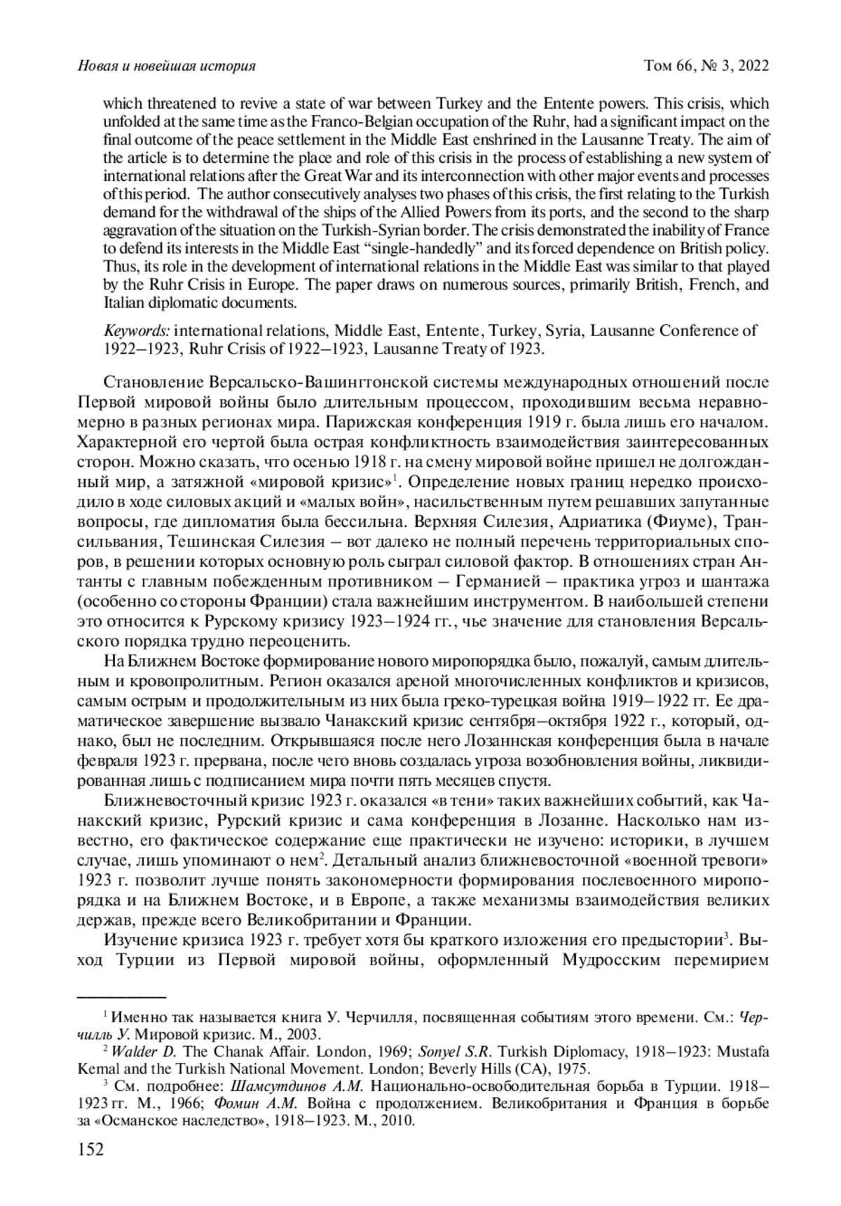 Статья посвящена ранее практически не изученному эпизоду в истории международных отношений, связанному с временным прекращением работы Лозаннской конференции по Ближнему Востоку в феврале 1923 г., что грозило возобновлением состояния войны между Турцией и державами Антанты. Этот кризис, происходивший одновременно с франкобельгийской оккупацией Рура, оказал значительное влияние на конечный результат мирного урегулирования на Ближнем Востоке, закрепленный в Лозаннском договоре. В работе ставится задача определить место и роль этого кризиса в процессе становления новой системы международных отношений после Первой мировой войны и его взаимосвязь с другими важнейшими событиями и процессами этого периода. Автор последовательно анализирует два этапа этого кризиса, первый из которых был связан с требованием Турции вывести корабли союзных держав из ее портов, а второй – с резким обострением обстановки на турецко-сирийской границе. Кризис показал неспособность Франции «в одиночку» отстаивать свои интересы на Ближнем Востоке и ее невольную зависимость от политики Великобритании. Таким образом, его роль в развитии международных отношений на Ближнем Востоке была аналогична той, которую сыграл Рурский кризис в Европе. Статья написана на основе британских, французских и итальянских дипломатических документов.