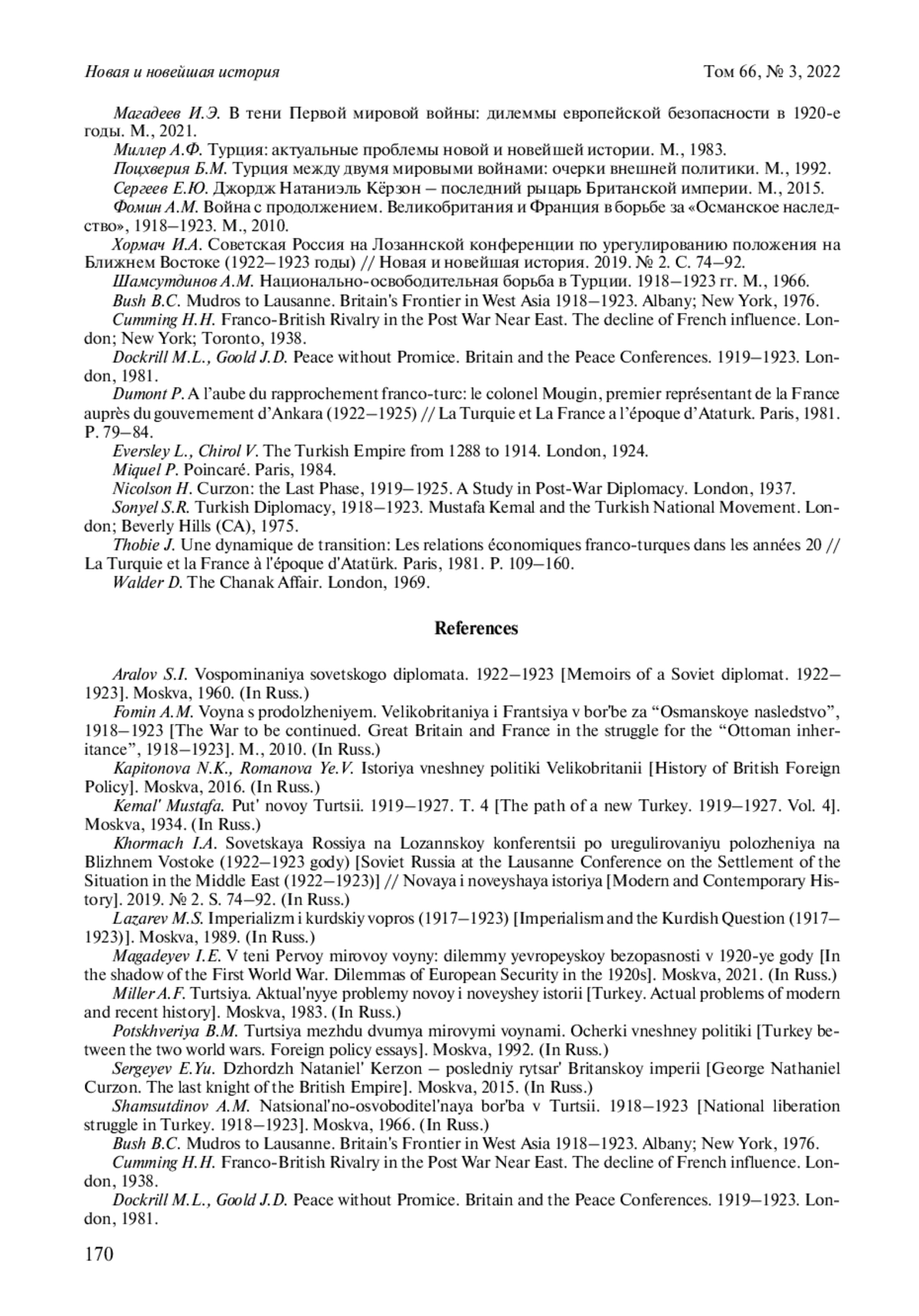 10. 	Хормач И.А. Советская Россия на Лозаннской конференции по урегулированию положения на Ближнем Востоке (1922-1923 годы) // Новая и новейшая история. 2019. № 2. С. 74-92. EDN: YDKAPX