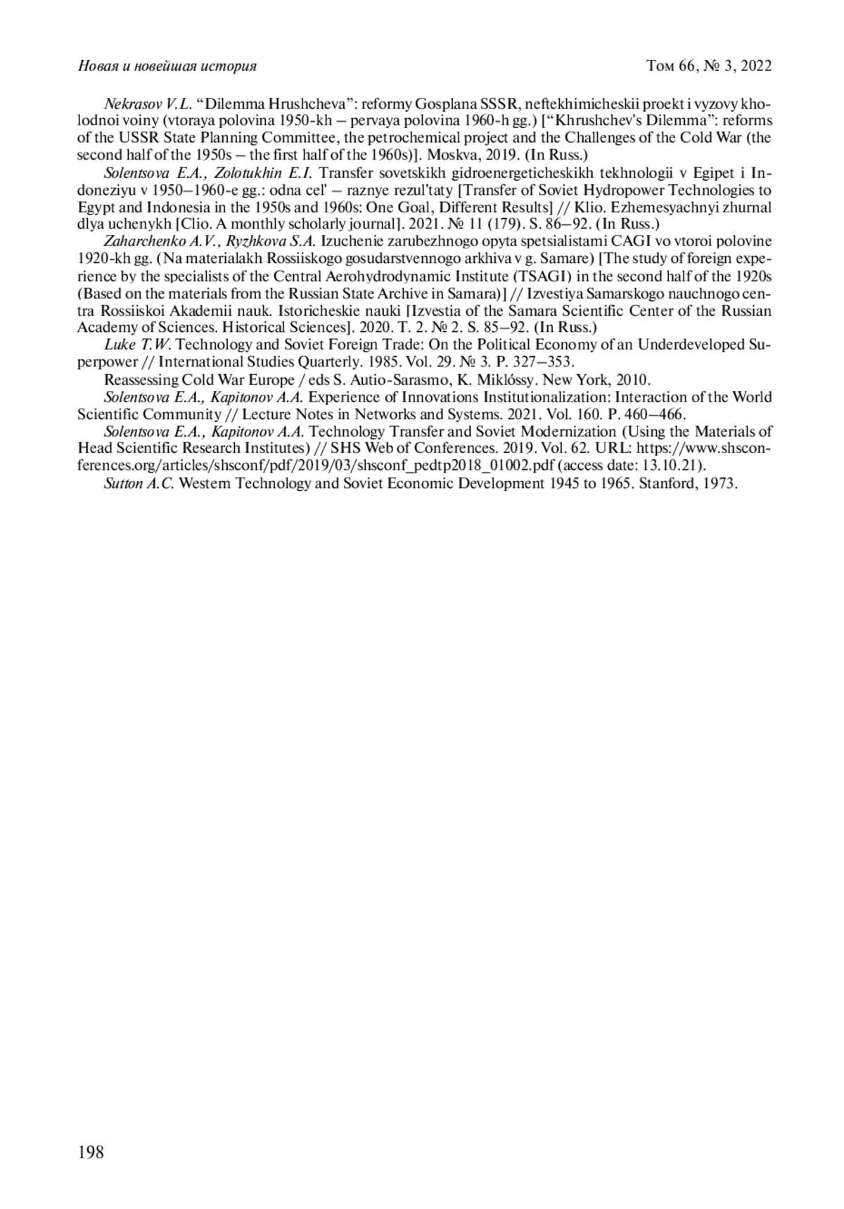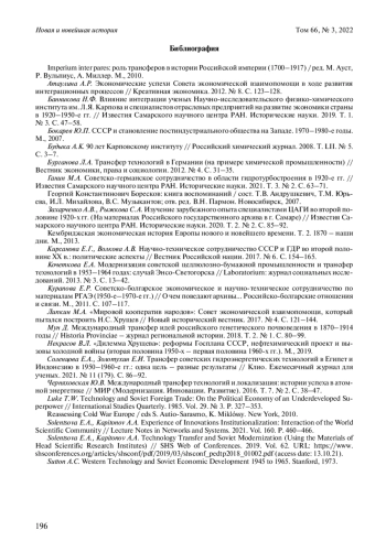 22. 	Solentsova E.A., Kapitonov A.A. Technology Transfer and Soviet Modernization (Using the Materials of Head Scientific Research Institutes) // SHS Web of Conferences. 2019. Vol. 62. URL: https://www.shs-conferences.org/articles/shsconf/pdf/2019/03/shsconf_pedtp2018_01002.pdf (access date: 13.10.21).