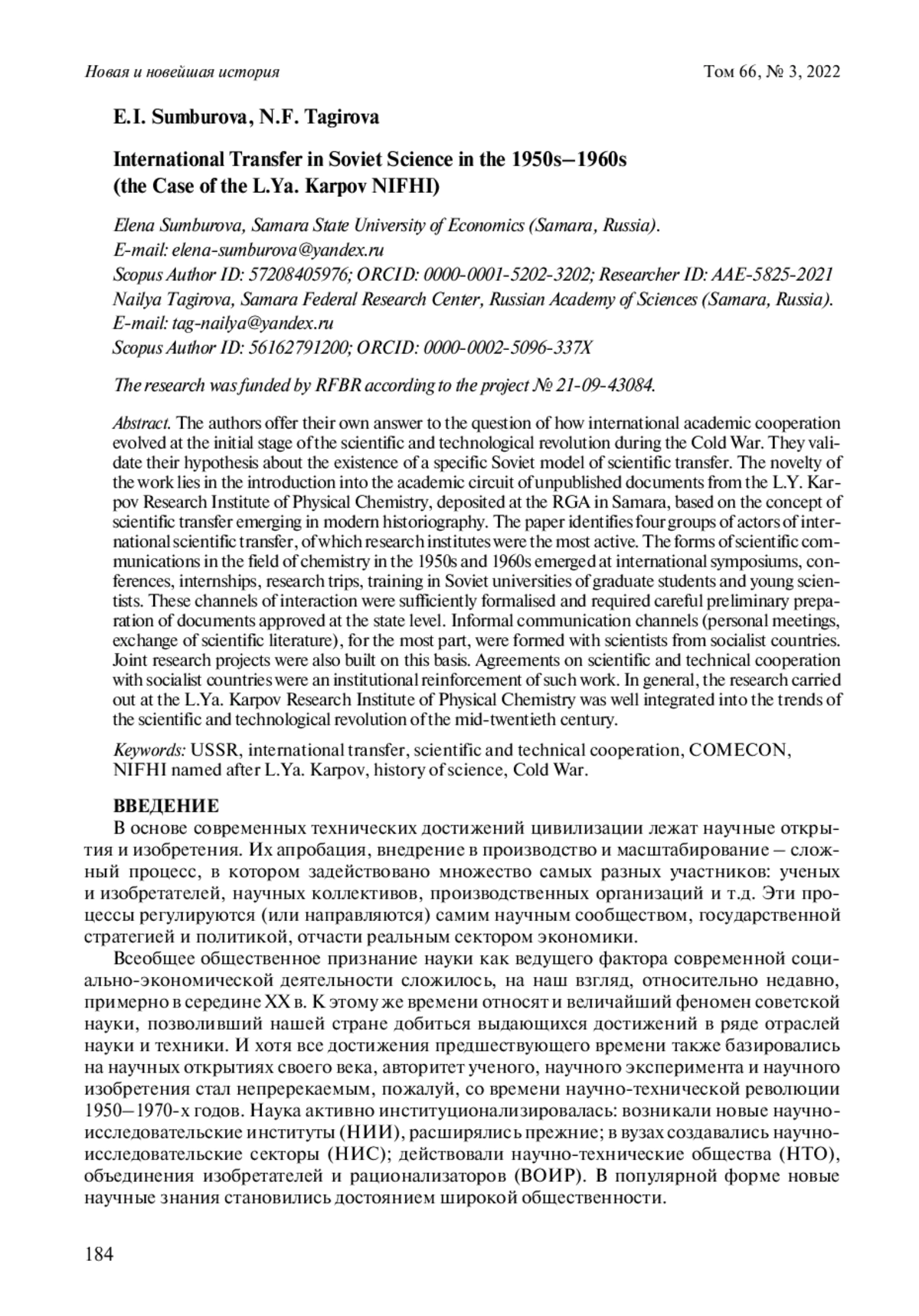 Авторы статьи предлагают свой вариант ответа на вопрос, как складывалось международное научное сотрудничество на начальном этапе научно-технической революции в годы холодной войны. Цель статьи состоит в выявлении влияния политического фактора на развитие науки, в частности химии. Авторы подтверждают гипотезу о существовании особой советской модели научного трансфера. Работа вводит в научный оборот документы Научно-исследовательского физико-химического института им. Л. Я. Карпова (НИФХИ им. Л. Я. Карпова), хранящиеся в Российском государственном архиве в Самаре. Методологической основой статьи стала формирующаяся в современной историографии концепция научного трансфера. В работе выделены четыре группы акторов международного научного трансфера, из которых наиболее активными были НИИ. Формы научной коммуникации в области химии в 1950–1960-х годах выстраивались во время международных симпозиумов, конференций, стажировок, заграничных командировок, обучения в советских вузах аспирантов и молодых ученых. Эти каналы взаимодействия были достаточно формализованы и требовали тщательной предварительной подготовки документов, утверждавшихся на государственном уровне. Неформальные коммуникации (личные встречи, обмен научной литературой) по большей части складывались с учеными из социалистических стран. На этой основе строились и совместные исследовательские проекты. Соглашения о научно-техническом сотрудничестве с социалистическими странами являлись институциональным подкреплением подобной работы. В целом исследования, проводившиеся в НИФХИ им. Л. Я. Карпова, были глубоко интегрированы в современные тенденции научно-технической революции середины ХХ в