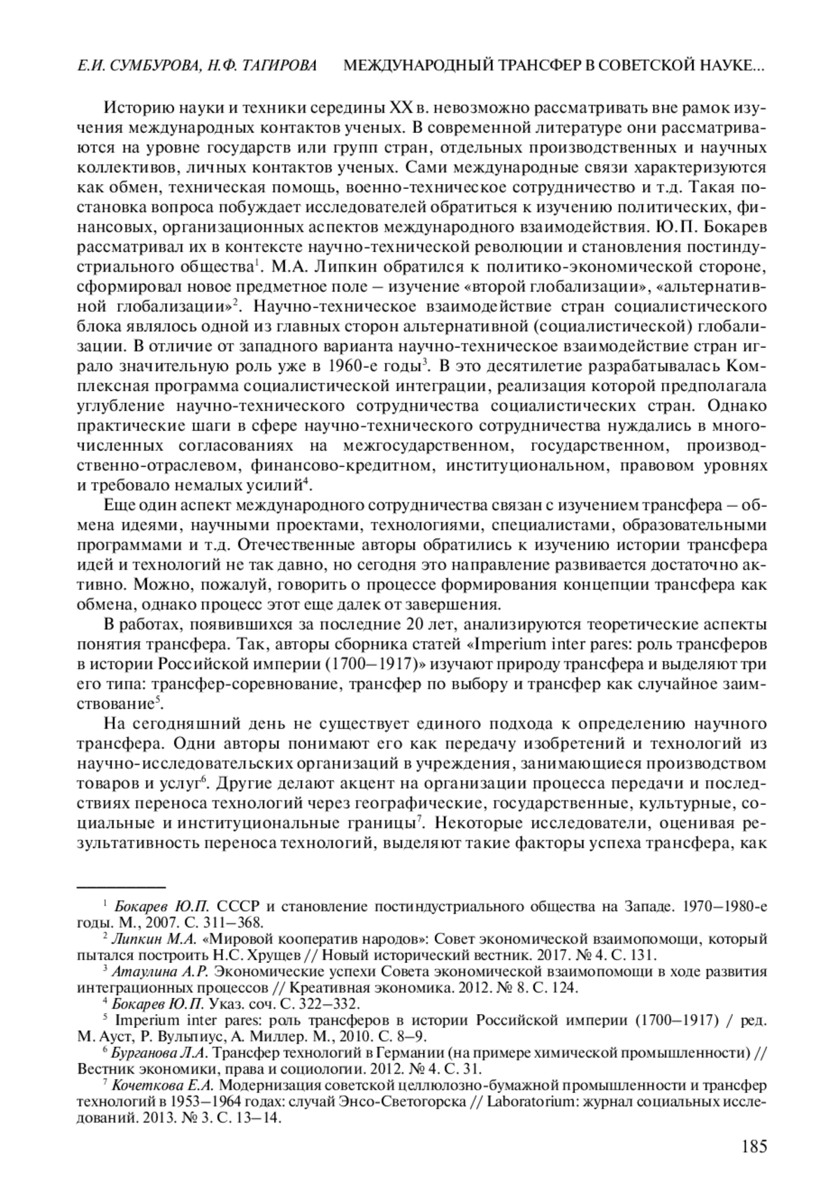 12. 	Кочеткова Е.А. Модернизация советской целлюлозно-бумажной промышленности и трансфер технологий в 1953-1964 годах: случай Энсо-Светогорска // Laboratorium: журнал социальных исследований. 2013. № 3. С. 13-42. EDN: UIICUL