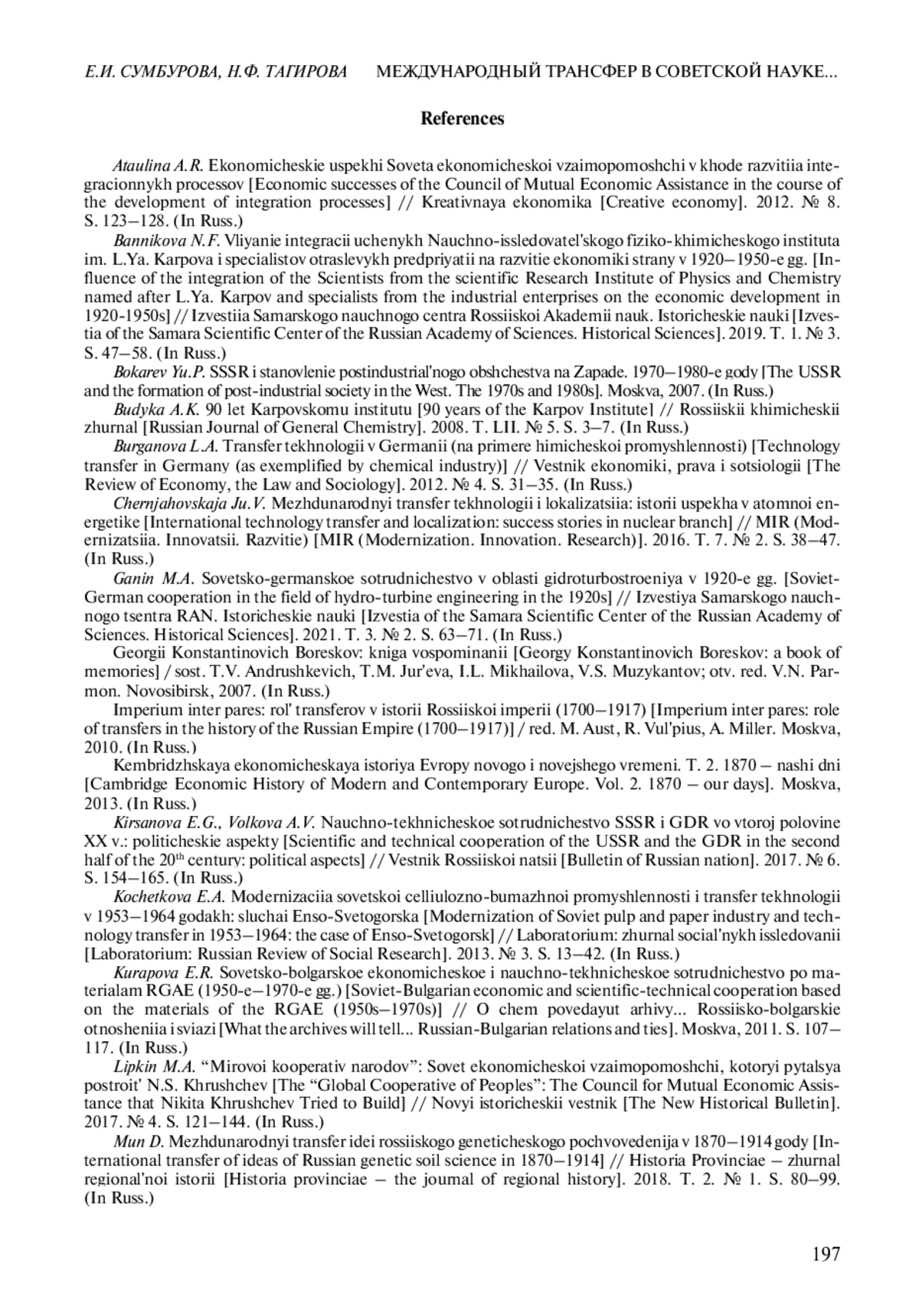 3. 	Банникова Н.Ф. Влияние интеграции ученых Научно-исследовательского физико-химического института им. Л.Я. Карпова и специалистов отраслевых предприятий на развитие экономики страны в 1920-1950-е гг. // Известия Самарского научного центра РАН. Исторические науки. Т. 1. № 3. 2019. С. 47-58. EDN: CXKTJZ