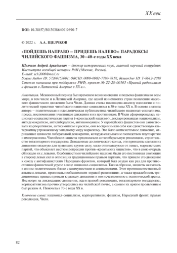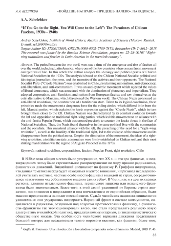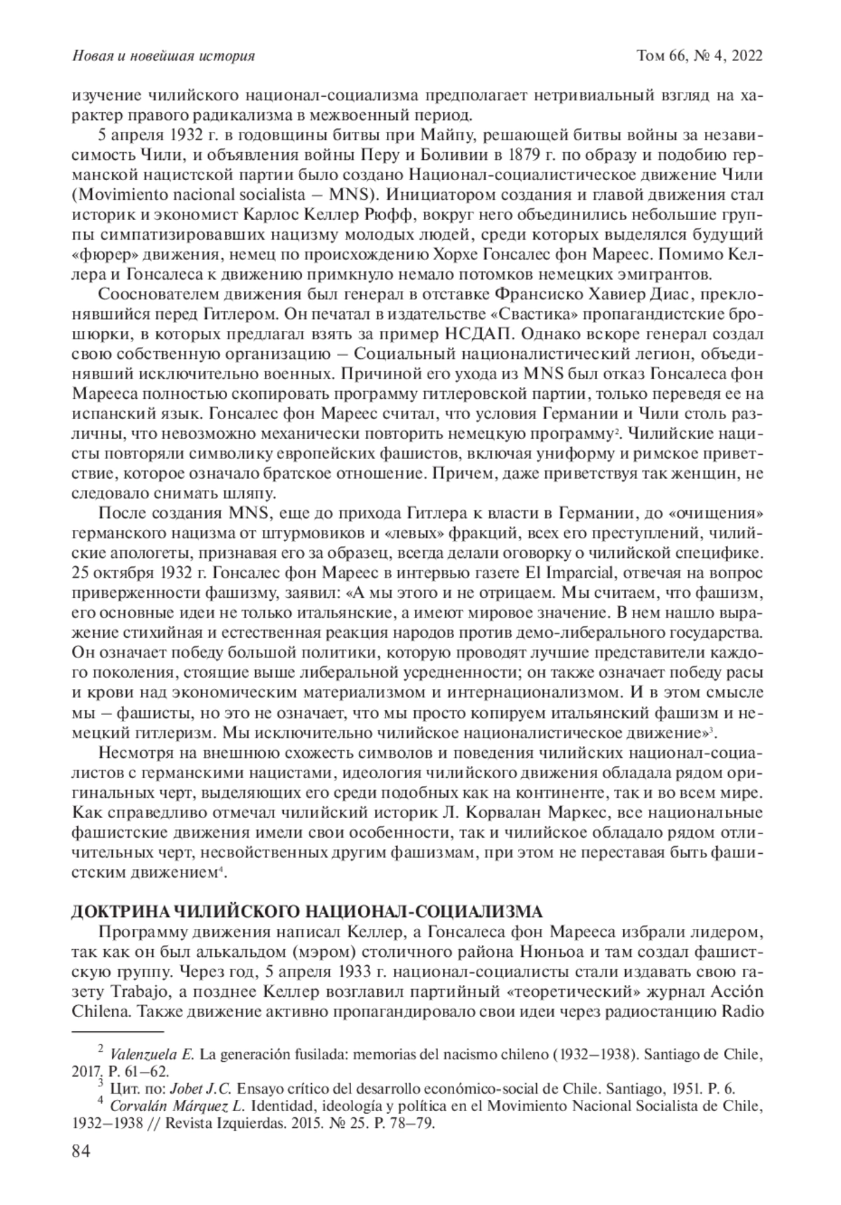 В 1930-е годы общим местом было утверждение, что ХХ в. – это эра фашизма, и подтверждением этому было стремительное распространение по миру правого радикализма, фашистских движений. Виднейший специалист по фашизму Р. Гриффин подчеркивал, что данная тематика всегда будет находиться в центре внимания, и призывал исследователей учитывать местные, частные особенности фашизма в каждой из стран, сосредоточившись на изучении «их собственного видения самих себя» 1. В Чили, как и в других странах региона, влияние итальянского фашизма, германского нацизма или испанского франкизма было значительным. Более того, в этой самой удаленной от Европы стране движения, появившиеся в подражание и под впечатлением от европейских образцов, были массово представлены на политической сцене. Судьба чилийских национал-социалистов удивительна: они умудрились поддержать Народный фронт в составе коммунистов, социалистов и радикалов, созданный под лозунгом противостояния фашизму, а фалангисты-франкисты так эволюционировали влево, что стали представлять реальную левую альтернативу в чилийской политике, предлагая коммунитарную, антикапиталистическую общественную модель