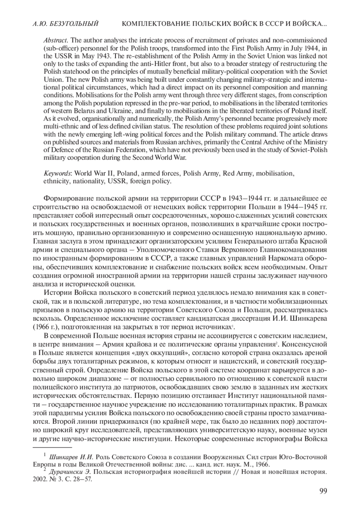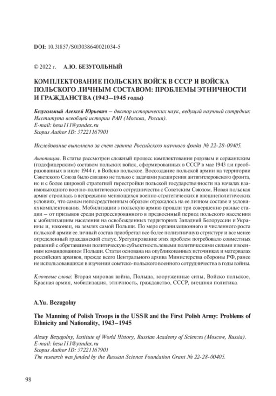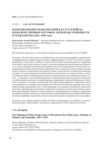 В статье рассмотрен сложный процесс комплектования рядовым и сержантским (подофицерским) составом польских войск, сформированных в СССР в мае 1943 г. и преобразованных в июле 1944 г. в Войско польское. Воссоздание польской армии на территории Советского Союза было связано не только с задачами расширения антигитлеровского фронта, но и с более широкой стратегией перестройки польской государственности на началах взаимовыгодного военно-политического сотрудничества с Советским Союзом. Новая польская армия строилась в непрерывно меняющихся военно-стратегических и внешнеполитических условиях, что самым непосредственным образом отражалось на ее личном составе и условиях комплектования. Мобилизации в польскую армию прошли три совершенно разные стадии – от призывов среди репрессированного в предвоенный период польского населения к мобилизациям населения на освобожденных территориях Западной Белоруссии и Украины и, наконец, на землях самой Польши. По мере организационного и численного роста польской армии ее личный состав приобретал все более полиэтничную структуру и все менее определенный гражданский статус. Урегулирование этих проблем потребовало совместных решений с обретавшими политическую субъектность левыми политическими силами и военным командованием Польши. Статья основана на опубликованных источниках и материалах российских архивов, прежде всего Центрального архива Министерства обороны РФ, ранее не использовавшихся в изучении советско-польского военного сотрудничества в годы войны.