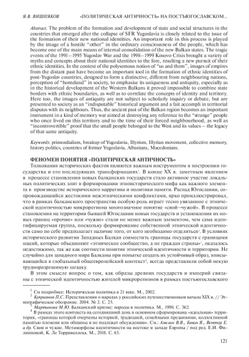 Проблема становления и развития государственных и общественных структур стран, возникших после распада Социалистической Федеративной Республики Югославии (СФРЮ), тесно cвязана с вопросом формирования их нового национального самосознания. Немаловажную роль в этом процессе играет наличие в обыденном сознании народа образа враждебного «другого», что стало одним из главных способов внутренней консолидации новых балканских государств. Под воздействием трагических событий югославской войны 1991–1995 гг., Косовского кризиса 1999 г. на повестке дня оказались разнообразные мифы и концепции возрождения национальной самобытности этих народов, и как следствие – новые поиски собственной этнической идентичности. В контексте многозначного понятия «свой–чужой» образы империй далекого прошлого стали важным инструментом в формировании этнической идентичности стран постъюгославского пространства, призванные сформировать в обществе особое, отличное от других соседних народов восприятие «родины», подчеркнуть собственную уникальность и древность, тем более что в условиях исторического развития Западных Балкан совместить границы государств с границами наций оказалось невозможно, так же как соотнести понятия идентичности и территории. И в данном случае образы античности не являются предметом научного поиска или дискуссии, а представляются обществу как «неоспоримый» исторический аргумент и свершившийся факт в территориальных спорах со своими соседями. Таким образом, античное, древнее прошлое Балканского региона становится как важным инструментом своеобразной войны памяти, призванной уничтожить всякое упоминание о некогда проживавшем на данной территории «чужом» народе и о времени вынужденного с ним соседства, так и «бесспорным» доказательством принадлежности малого народа к Западу и его ценностям – наследию все той же античности