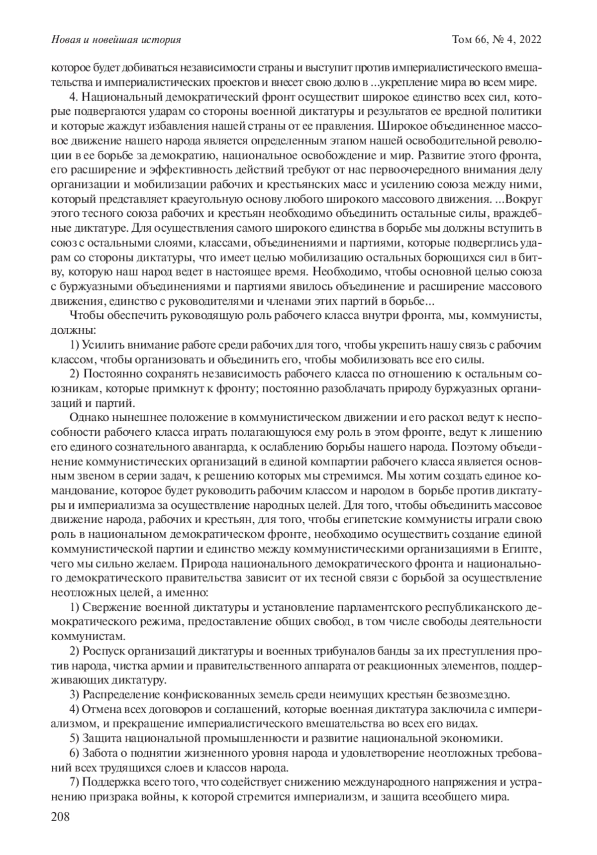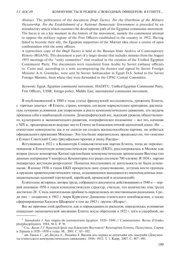 Публикацию документа «Проект тактики. За свержение военной диктатуры. За создание национального демократического правительства» предваряет вступительная статья, в которой рассматривается путь развития египетского коммунистического движения. Контроль над Суэцким каналом, господство иностранного капитала в банковско-финансовой сфере, оставшееся не реализованным обещание вывода британских вооруженных сил, бесконечные манипуляции с договорными отношениями между Лондоном и Каиром – все это содействовало общественному размежеванию. Коммунистические структуры были расколоты. Наиболее крупные из них – Движение египетского освобождения и «Искра» – слились в 1947 г., создав Демократическое движение национального освобождения – ХАДЕТУ. Основное внимание уделено ключевому моменту в истории этого движения – попытке коммунистов выступить против установленного в стране в 1952 г. военного режима «Свободных офицеров». Потерпев неудачу в стремлении стать его союзником, египетские сторонники марксистской идеи избрали курс открытого противостояния армейским офицерам.