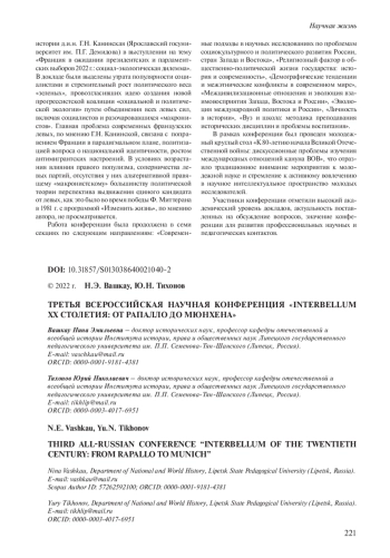 22 апреля 2022 г. Центр германских исторических исследований Института истории, права и общественных наук Липецкого государственного педагогического университета им. П. П. Семенова-Тян-Шанского (ИИПиОН ЛГПУ) провел Третью всероссийскую научную конференцию «Interbellum ХХ столетия: от Рапалло до Мюнхена», посвященную 100-летнему юбилею советско-германского Рапалльского договора 1922 г. Было представлено более 30 докладов и сообщений, затрагивающих различные проблемы международных отношений в межвоенный период. Модератором первой части конференции был профессор кафедры отечественной и всеобщей истории ЛГПУ д. и. н. Ю. Н. Тихонов