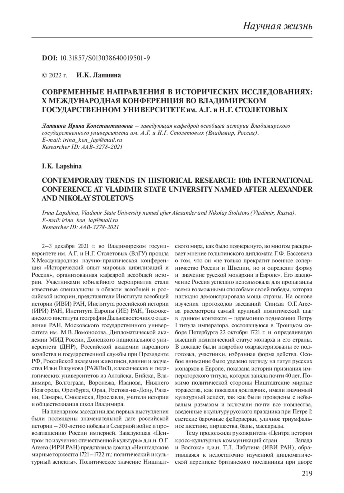 2–3 декабря 2021 г. во Владимирском госуниверситете им. А. Г. и Н. Г. Столетовых (ВлГУ) прошла X Международная научно-практическая конференция «Исторический опыт мировых цивилизаций и Россия», организованная кафедрой всеобщей истории. Участниками юбилейного мероприятия стали известные специалисты в области всеобщей и российской истории, представители Института всеобщей истории (ИВИ) РАН, Института российской истории (ИРИ) РАН, Института Европы (ИЕ) РАН, Тихоокеанского института географии Дальневосточного отделения РАН, Московского государственного университета им. М. В. Ломоносова, Дипломатической академии МИД России, Донецкого национального университета (ДНР), Российской академии народного хозяйства и государственной службы при Президенте РФ, Российской академии живописи, ваяния и зодчества Ильи Глазунова (РАЖВиЗ), классических и педагогических университетов из Алтайска, Бийска, Владимира, Волгограда, Воронежа, Иванова, Нижнего Новгорода, Оренбурга, Орла, Ростова-на-Дону, Рязани, Самары, Смоленска, Ярославля, учителя истории и обществознания школ Владимира