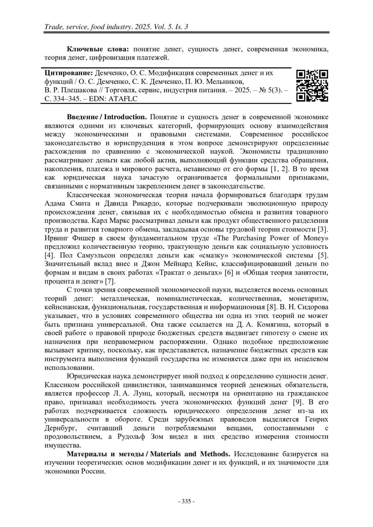 Современные условия функционирования мировой и российской экономики характеризуются высокой степенью нестабильности, инфляционными рисками, трансформацией платежной инфраструктуры и активным развитием цифровых технологий. На этом фоне денежная система как один из ключевых элементов макроэкономического механизма испытывает значительные структурные изменения. Происходит переосмысление и трансформация классических функций денег – меры стоимости, средства обращения, платежа, накопления и мировых денег. Возрастающее значение приобретают цифровые формы валюты, включая проект цифрового рубля, внедряемый Центральным банком Российской Федерации, а также инновационные финансовые инструменты. Это делает актуальным научный анализ степени модификации и эффективности выполнения деньгами их традиционных функций в современных условиях, а также выработку практических рекомендаций по их совершенствованию.