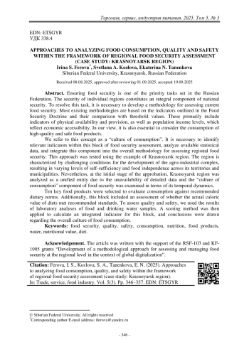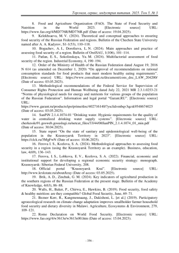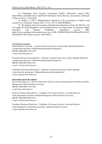 16. Ферова, И. С. Методические подходы к оценке продовольственной безопасности региона (на примере Красноярского края) / И. С. Ферова, С. А. Козлова // Бизнес, образование, право. – 2024. – № 4(69). – С. 136–143.