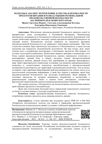 Обеспечение продовольственной безопасности является одной из приоритетных задач, поставленных в Российской Федерации. Национальная безопасность складывается из безопасности субъектов или регионов. Для решения этой задачи необходимо разработать методику оценки продовольственной безопасности на текущий момент. Большинство методик опирается на показатели Доктрины продовольственной безопасности и их сравнение с пороговыми значениями. При этом в качестве основных берут физическую доступность и обеспеченность, а также доходы населения как показатели экономической доступности. На наш взгляд, речь также должна идти о потреблении качественных и безопасных продуктов. Мы назвали это условно «культурой потребления». Необходимо выявить критерии и индикаторы этого блока оценки продовольственной безопасности, оценить имеющуюся статистику и интегрировать данный блок в общую методику оценки продовольственной безопасности региона. Данный подход был апробирован на примере Красноярского края. Край характеризуется непростыми условиями для развития агропромышленного комплекса и, соответственно, показатели самообеспечения и продовольственной независимости различаются для территорий и муниципалитетов региона. Тем не менее, на первом этапе апробации Красноярский край рассматривался как единое целое из-за недостаточной детализации информации, а нами был оценен в динамике такой блок продовольственной безопасности, как «культура потребления». Были выбраны 10 ключевых продуктов, по которым оценивалось потребление в соответствии с рациональными нормами. Также в данном блоке учитывалось соответствие фактической энергетической ценности рациона рекомендуемым значениям.