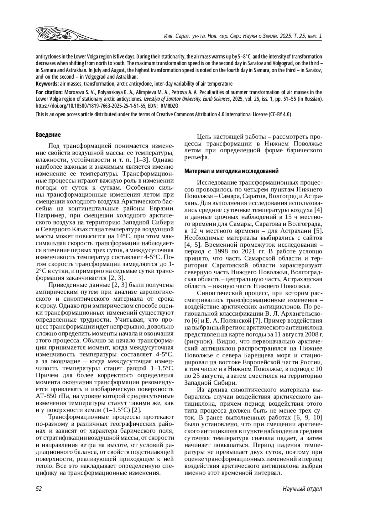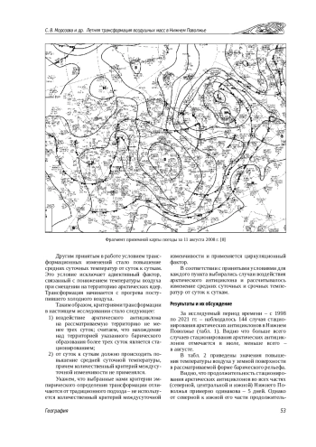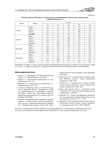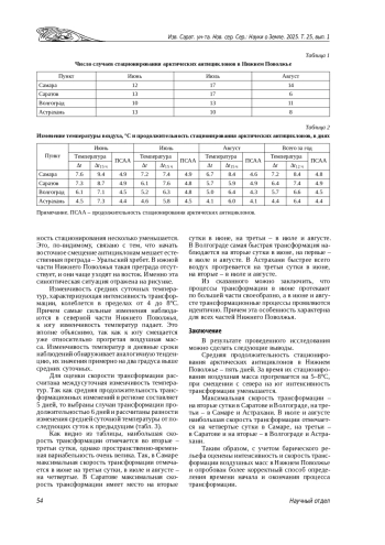 Введение. Под трансформацией понимается изменение свойств воздушной массы: ее температуры, влажности, устойчивости. Особенно сильны трансформационные изменения летом при смещении холодного воздуха Арктического бассейна на континентальные районы Евразии. При эмпирическом изучении процесса трансформации существуют сложности, связанные с определением ее начала и окончания. Учитывая, что трансформационные процессы сильно зависят от географических и метеорологических факторов, в настоящей статье рассмотрим особенности протекания этих процессов в Нижнем Поволжье. Теоретический анализ. Рассматриваются интенсивность и скорость трансформации. За интенсивность трансформации принята величина повышения средней суточной температуры воздуха при стационировании арктического антициклона. Скорость трансформации оценивалась по величине междусуточной изменчивости температур.