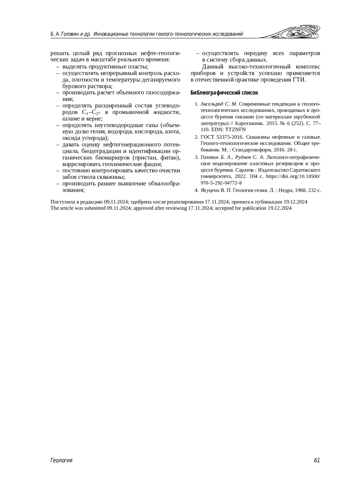 1. 	Аксельрод С. М. Современные тенденции в геологотехнологических исследованиях, проводимых в процессе бурения скважин (по материалам зарубежной литературы) // Каротажник. 2015. № 6 (252). С. 77- 110. EDN: TTZNFN