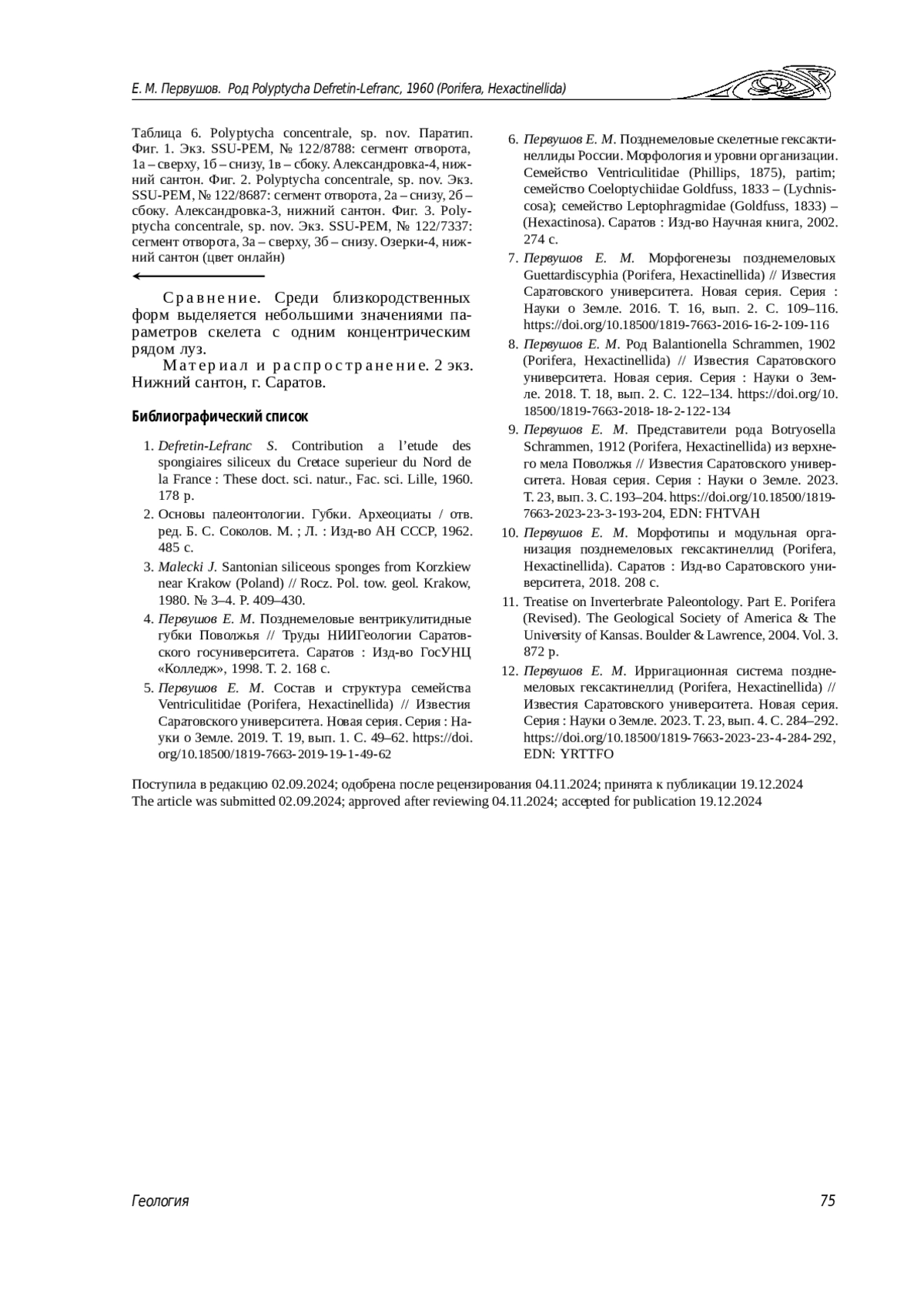 12. 	Первушов Е. М. Ирригационная система позднемеловых гексактинеллид (Porifera, Hexactinellida) // Известия Саратовского университета. Новая серия. Серия: Науки о Земле. 2023. Т. 23, вып. 4. С. 284-292. ,. DOI: 10.18500/1819-7663-2023-23-4-284-292 EDN: YRTTFO