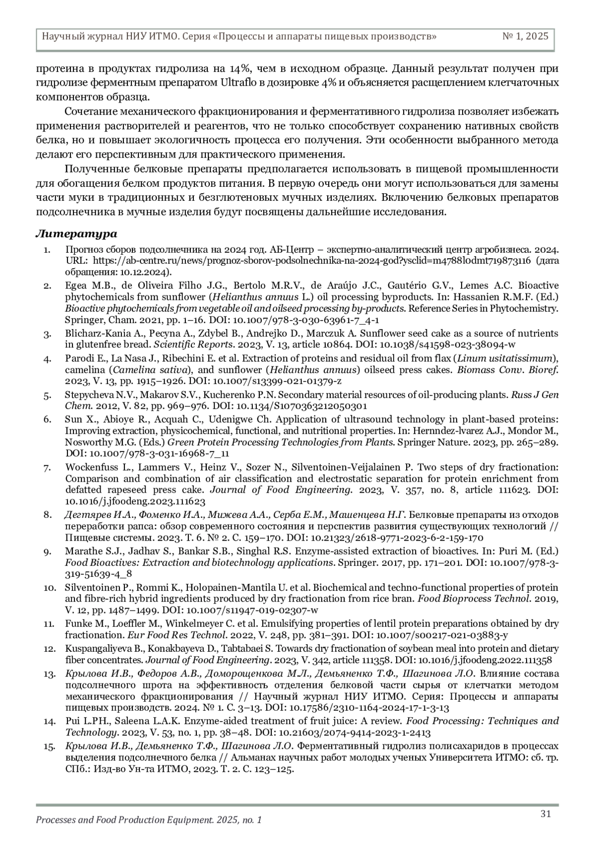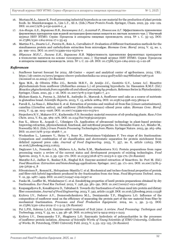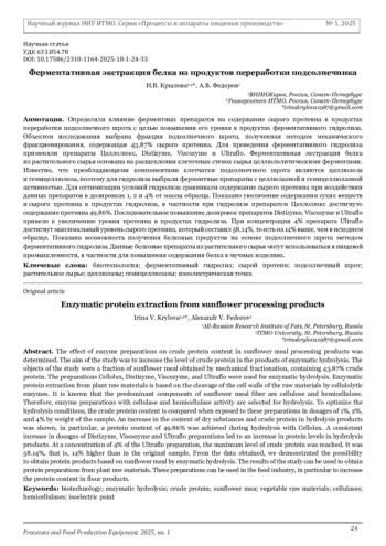 15. Крылова И.В., Демьяненко Т.Ф., Шагинова Л.О. Ферментативный гидролиз полисахаридов в процессах выделения подсолнечного белка // Альманах научных работ молодых ученых Университета ИТМО: сб. тр. СПб.: Изд-во Ун-та ИТМО, 2023. Т. 2. С. 123-125.