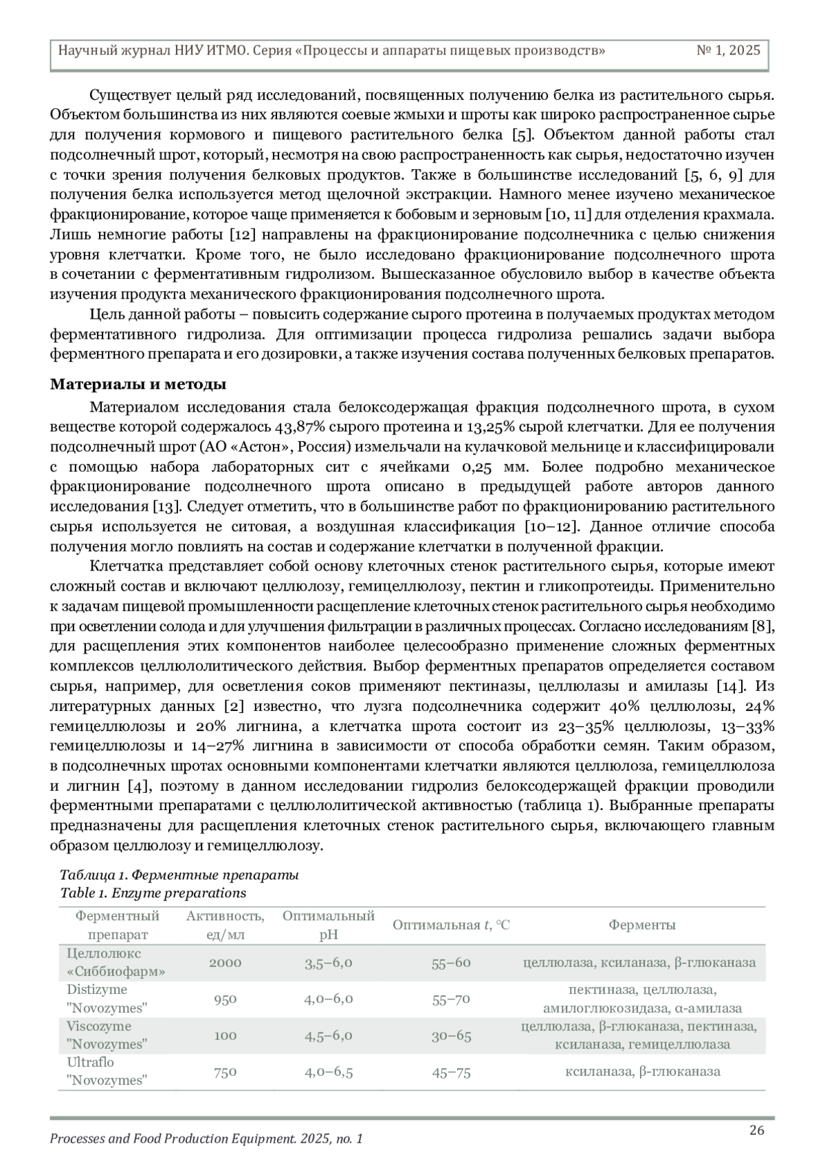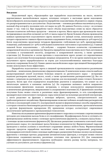 Подсолнечный шрот, образующийся при переработке подсолнечника на масло, является перспективным высокобелковым сырьем, потенциал которого в настоящее время недооценен. Целесообразность использования продуктов переработки подсолнечника объясняется в первую очередь его распространенностью и доступностью. Подсолнечник – основная российская масличная культура, валовый сбор которой в последние пять лет вырос на 35%. По данным Росстата, в 2023 г. он составил свыше 17 тыс. тонн [1]. При переработке такого объема подсолнечных семян на масло образуется большое количество побочных продуктов – жмыхов и шротов. Масса шрота при производстве масла экстракционным способом составляет до 60% от массы сырья [2]. Кроме больших объемов производства важным преимуществом подсолнечного шрота является его ценный состав, питательная ценность которого определяется главным образом высоким содержанием белка, составляющим до 40% шрота [3]. Белок подсолнечника представлен четырьмя фракциями: глобулинами (40–90%, преимущественно гелиантин), альбуминами (10–30%) и небольшим количеством глютелинов и проламинов [4]. Главный запасной белок подсолнечника – 11S-глобулин – содержит большое количество глутаминовой, аспарагиновой кислоты и аргинина [5]. Продукты переработки подсолнечника могут быть источником глутамина и глутаминовой кислоты, аспарагина и аспарагиновой кислоты, а также аргинина и цистеина [2]. Количество и состав протеина в подсолнечном шроте делают его перспективным сырьем для получения белоксодержащих пищевых ингредиентов. В то же время значительная часть полученного шрота перерабатывается на корма для сельскохозяйственных животных благодаря высокому содержанию белка [2]. Однако данное высокобелковое сырье при пищевой биопереработке можно использовать более эффективно.