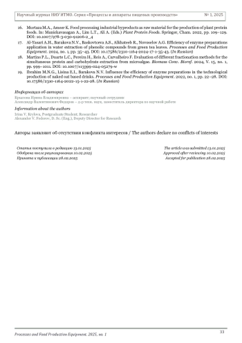 19. Ибрахим М.Н.Г., Лисина Е.И., Баракова Н.В. Эффективность применения ферментных препаратов в технологии напитков на основе голозерного овса // Научный журнал НИУ ИТМО. Серия: Процессы и аппараты пищевых производств. 2022. № 1. С. 22-28.