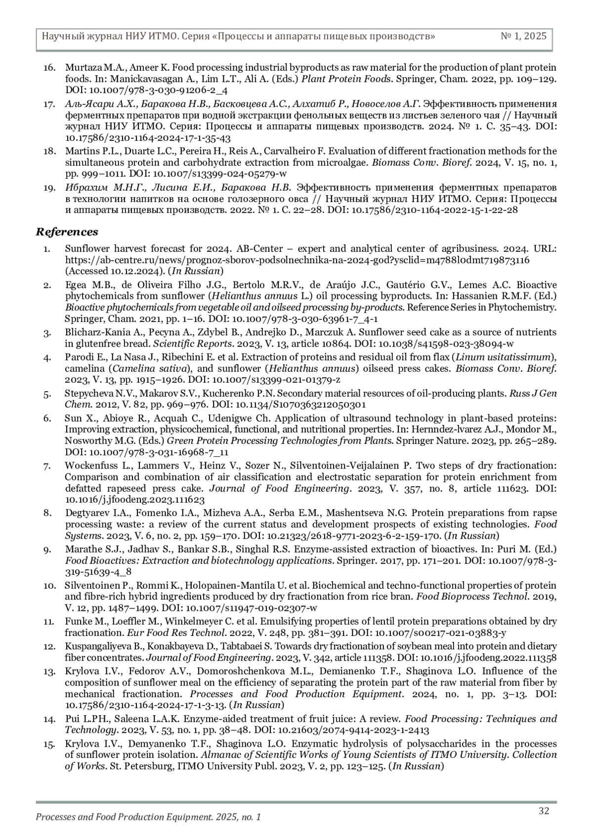 13. Крылова И.В., Федоров А.В., Доморощенкова М.Л., Демьяненко Т.Ф., Шагинова Л.О. Влияние состава подсолнечного шрота на эффективность отделения белковой части сырья от клетчатки методом механического фракционирования // Научный журнал НИУ ИТМО. Серия: Процессы и аппараты пищевых производств. 2024. № 1. С. 3-13. DOI: 10.17586/2310-1164-2024-17-1-3-13