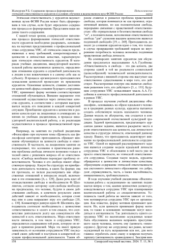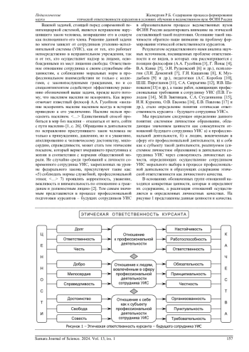 В статье выявляется необходимость подготовки курсанта - будущего сотрудника УИС, которому присуща этическая ответственность как системное личностное образование, обладающее значением ценности как совокупности отношений будущего сотрудника УИС к служебной деятельности, к вовлеченным в сферу этой деятельности людям, к себе как к субъекту такой деятельности, реализуемое (системное личностное образование) в деятельности сотрудника УИС через совокупность личностных качеств, определяющих осуществление сотрудником УИС морального выбора в процессе профессиональной деятельности и образующих содержание этической ответственности как личностного качества. Предлагается определение понятия «этическая ответственность курсанта ведомственного вуза ФСИН России - будущего сотрудника УИС» и его содержательное наполнение (ценности, отношения, личностные качества). Обосновывается, что содержание процесса формирования этической ответственности курсантов базируется на научных представлениях о профессиональной этике сотрудника УИС, об этическом смысле предъявляемых к нему требований, конкретизируемых в ценностях и личностных качествах, характеризующих этическую ответственность курсантов. Аргументируется, что реализация данного содержания осуществляется через вычленение в материале учебных дисциплин и внеаудиторной воспитательной работы ценностей, определяющих отношение курсанта к служебной деятельности, к людям в нее вовлеченным и к самому себе как ее субъекту, приобщение курсанта к этим ценностям и развитие у него личностных качеств, через которые осуществляется внешнее выражение названных отношений. Приводятся примеры реализации содержания процесса формирования этической ответственности курсантов: занятия по учебным дисциплинам и мероприятия в рамках внеаудиторной воспитательной работы, на которых идет приобщение курсантов к ценностям и развитие качеств, реализуемых затем в рамках производственной практики.