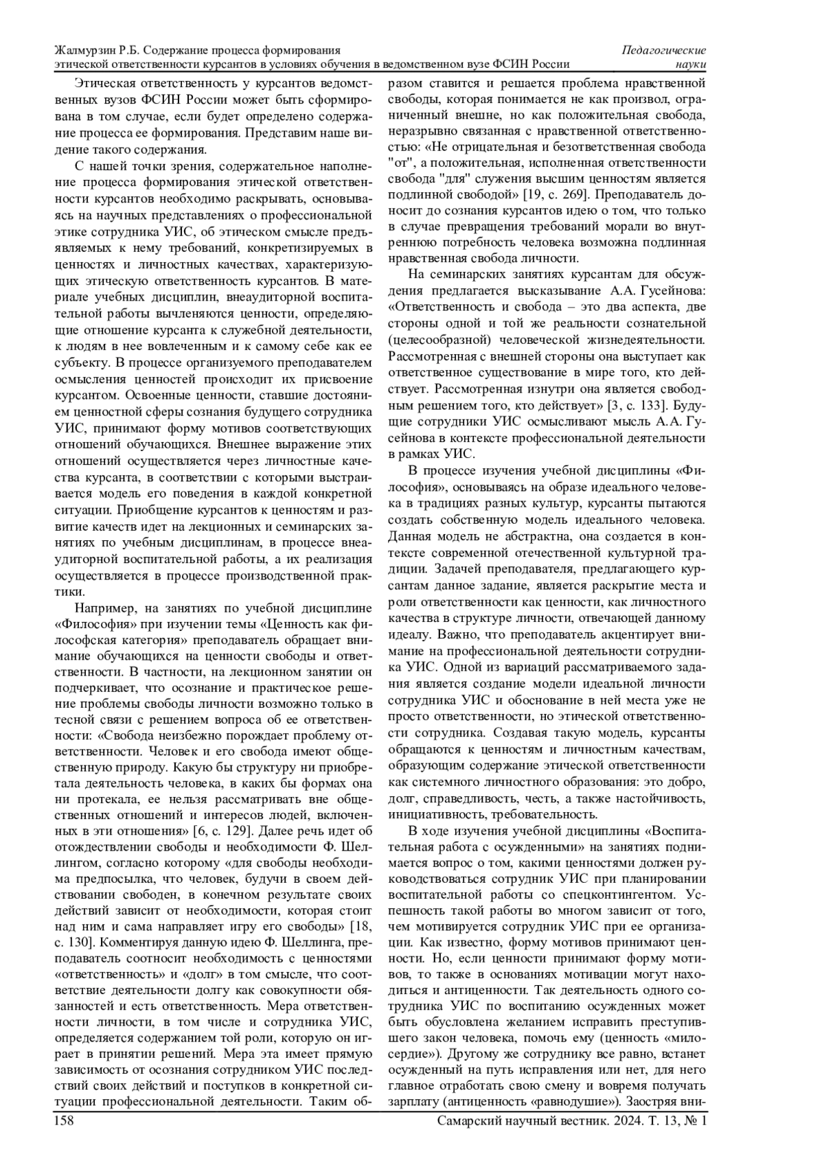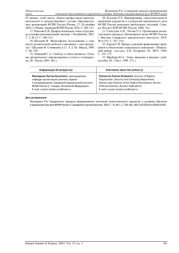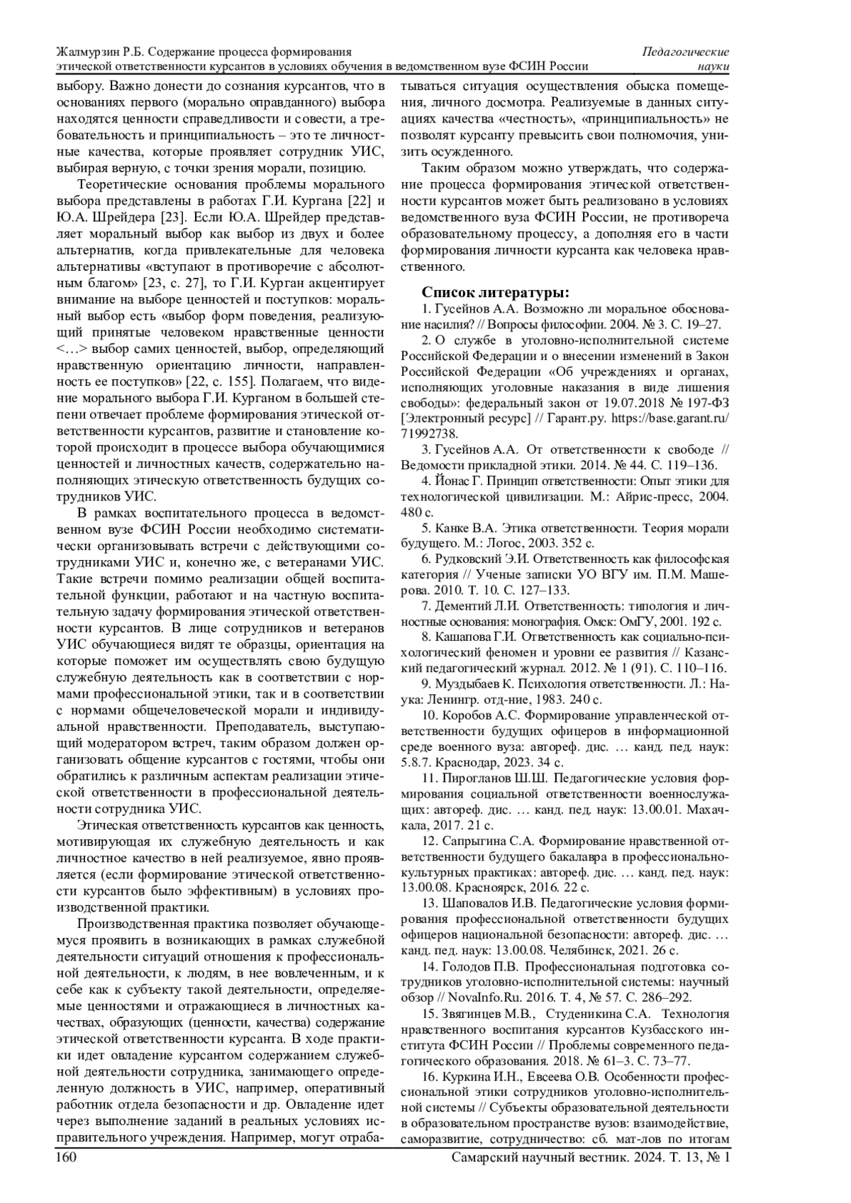 13. 	Шаповалов И.В. Педагогические условия формирования профессиональной ответственности будущих офицеров национальной безопасности: автореф. дис. … канд. пед. наук: 13.00.08. Челябинск, 2021. 26 с. EDN: CUHADI