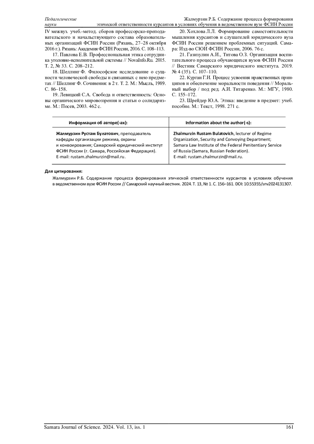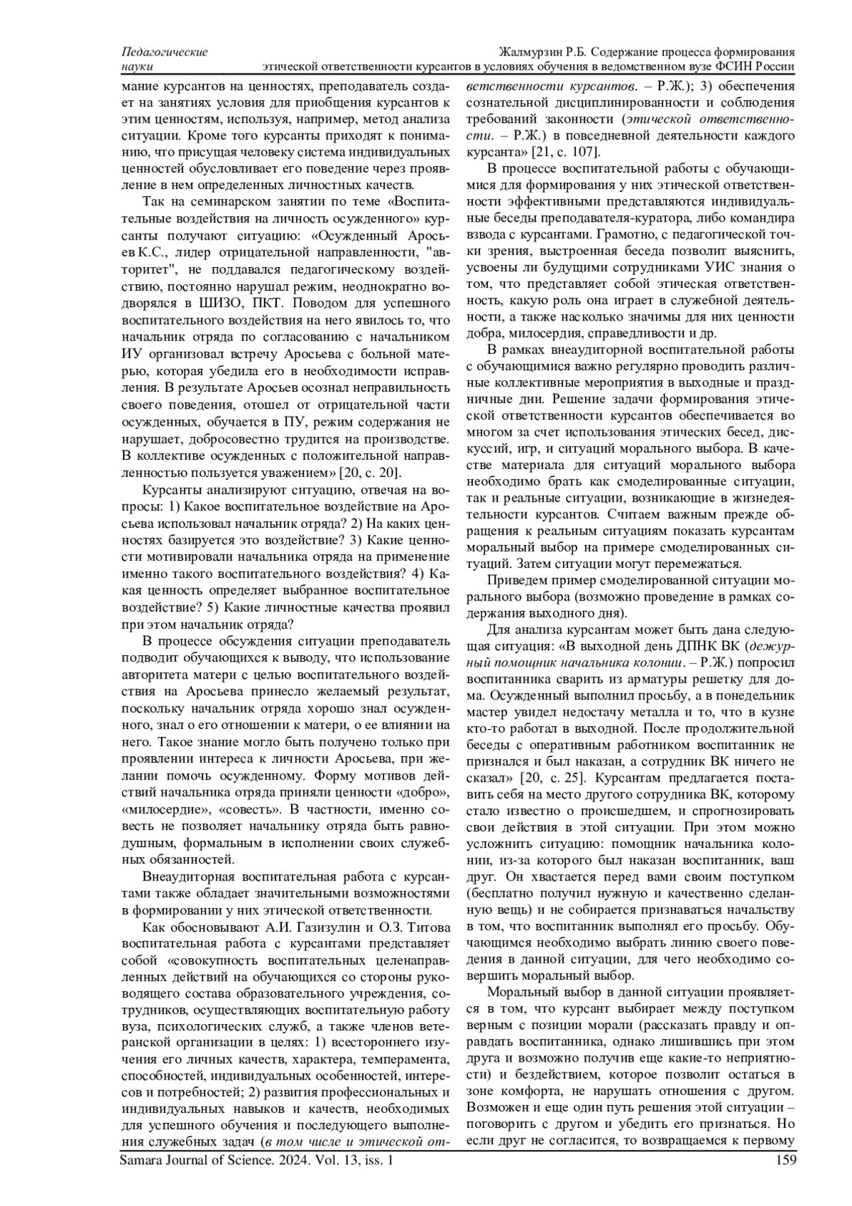 20. 	Хохлова Л.Л. Формирование самостоятельности мышления курсантов и слушателей юридического вуза ФСИН России решением проблемных ситуаций. Самара: Изд-во СЮИ ФСИН России, 2006. 76 с. 21. 	Газизулин А.И., Титова О.З. Организация воспитательного процесса обучающихся вузов ФСИН России // Вестник Самарского юридического института. 2019. № 4 (35). С. 107-110. EDN: XHOVNV