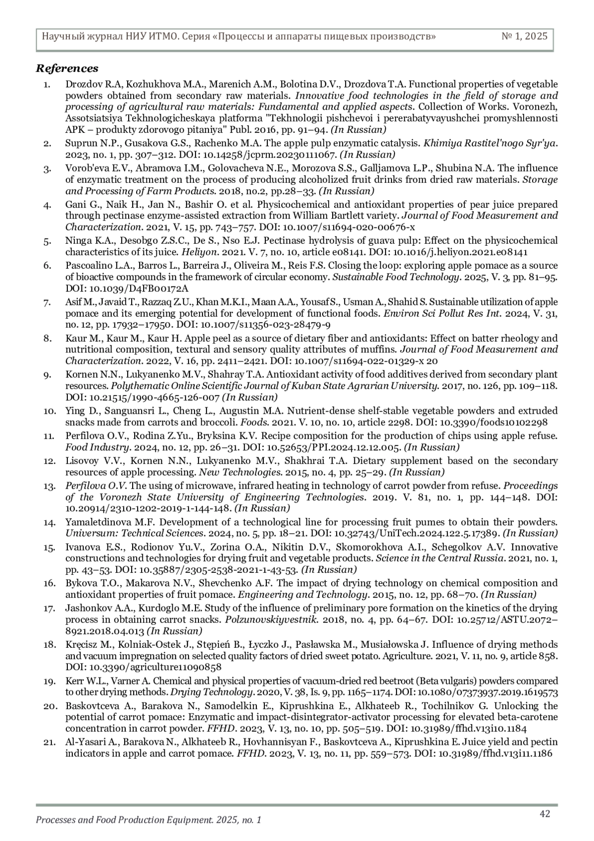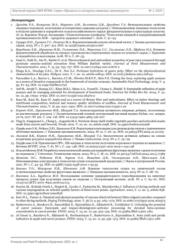 14. 	Ямалетдинова М.Ф. Разработка технологической линии для переработки фруктовых выжимок с целью получения их порошков // Universum. Технические науки. 2024. № 5. С. 18-21. DOI: 10.32743/UniTech.2024.122.5.17389