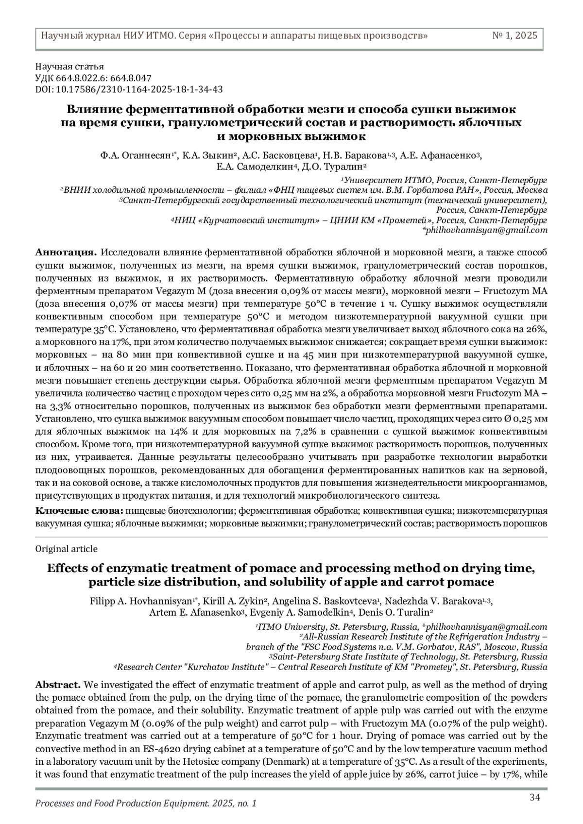 20. 	Baskovtceva A., Barakova N., Samodelkin E., Kiprushkina E., Alkhateeb R., Tochilnikov G. Unlocking the potential of carrot pomace: Enzymatic and impact-disintegrator-activator processing for elevated beta-carotene concentration in carrot powder. FFHD. 2023, V. 13, no. 10, pp. 505-519. DOI: 10.31989/ffhd.v13i10.1184