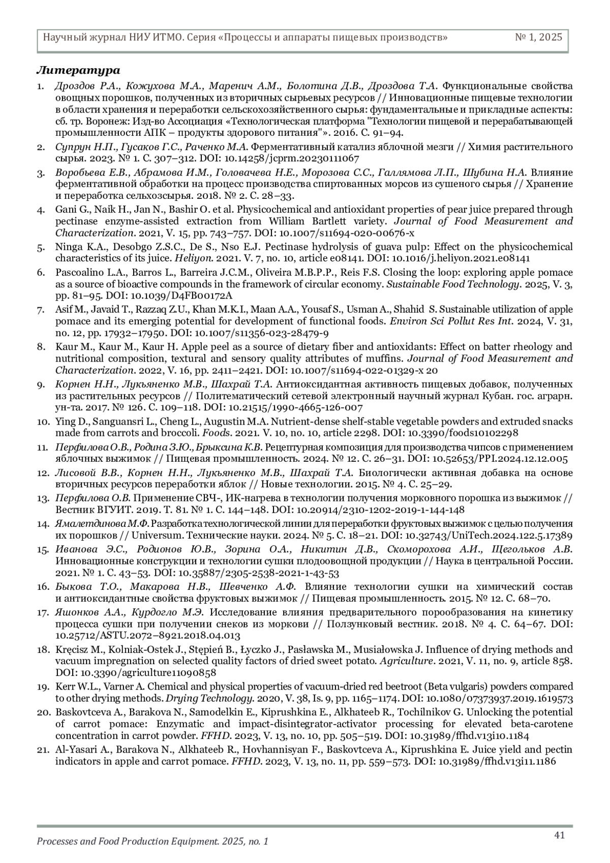 11. 	Перфилова О.В., Родина З.Ю., Брыксина К.В. Рецептурная композиция для производства чипсов с применением яблочных выжимок // Пищевая промышленность. 2024. № 12. С. 26-31. DOI: 10.52653/PPI.2024.12.12.005