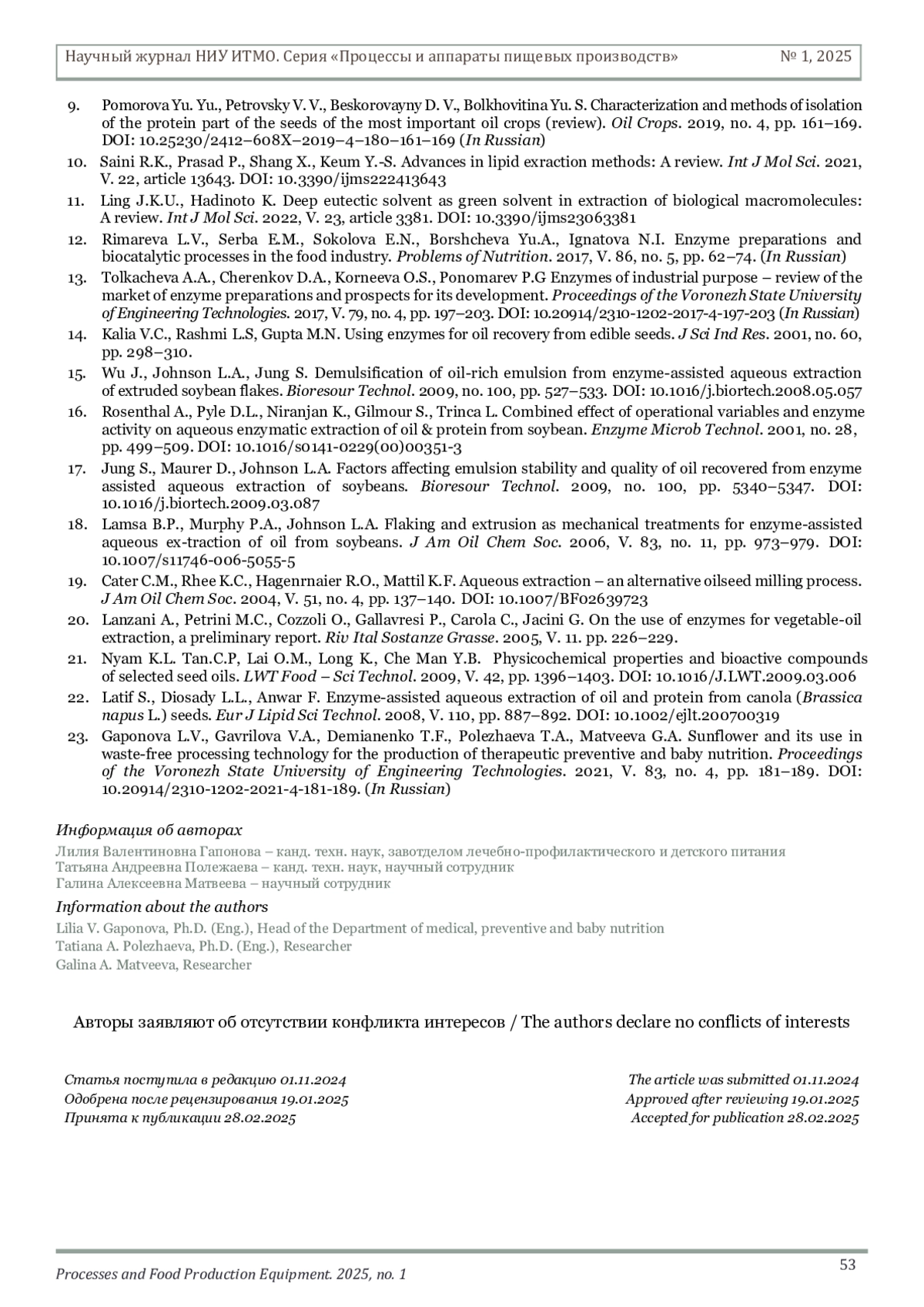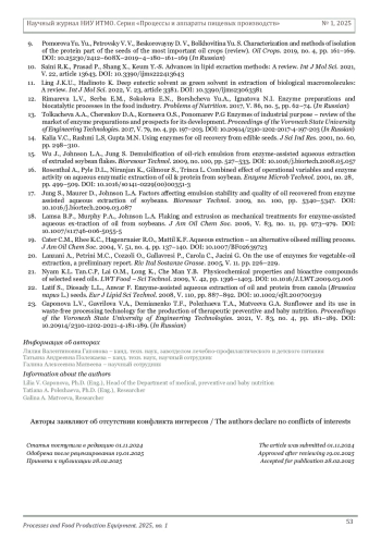 9. 	Поморова Ю.Ю., Пятовский В.В., Бескоровайный Д.В., Болховитина Ю.С. Характеристика, методы выделения белковой фракции семян основных масличных культур (обзор) // Масличные культуры. 2019. № 4. С. 161-169. Х-2019-4-180-161-169. DOI: 10.25230/2412-608