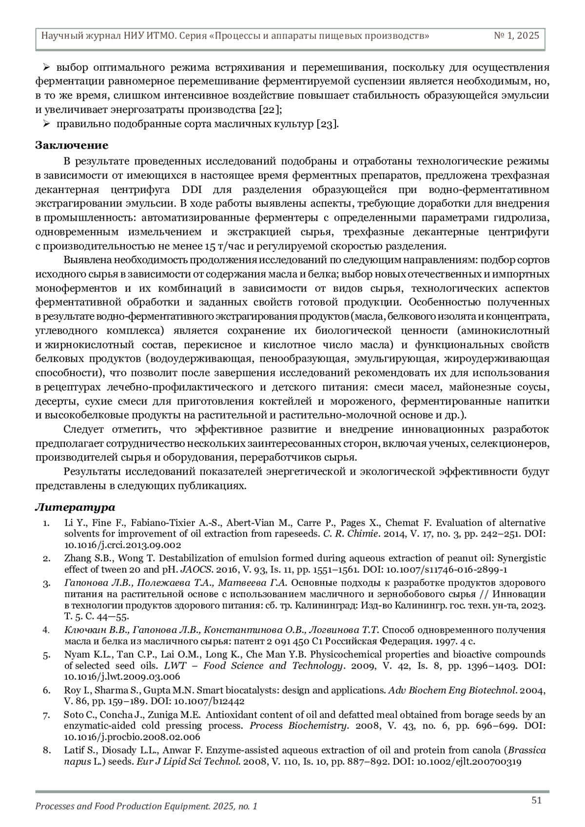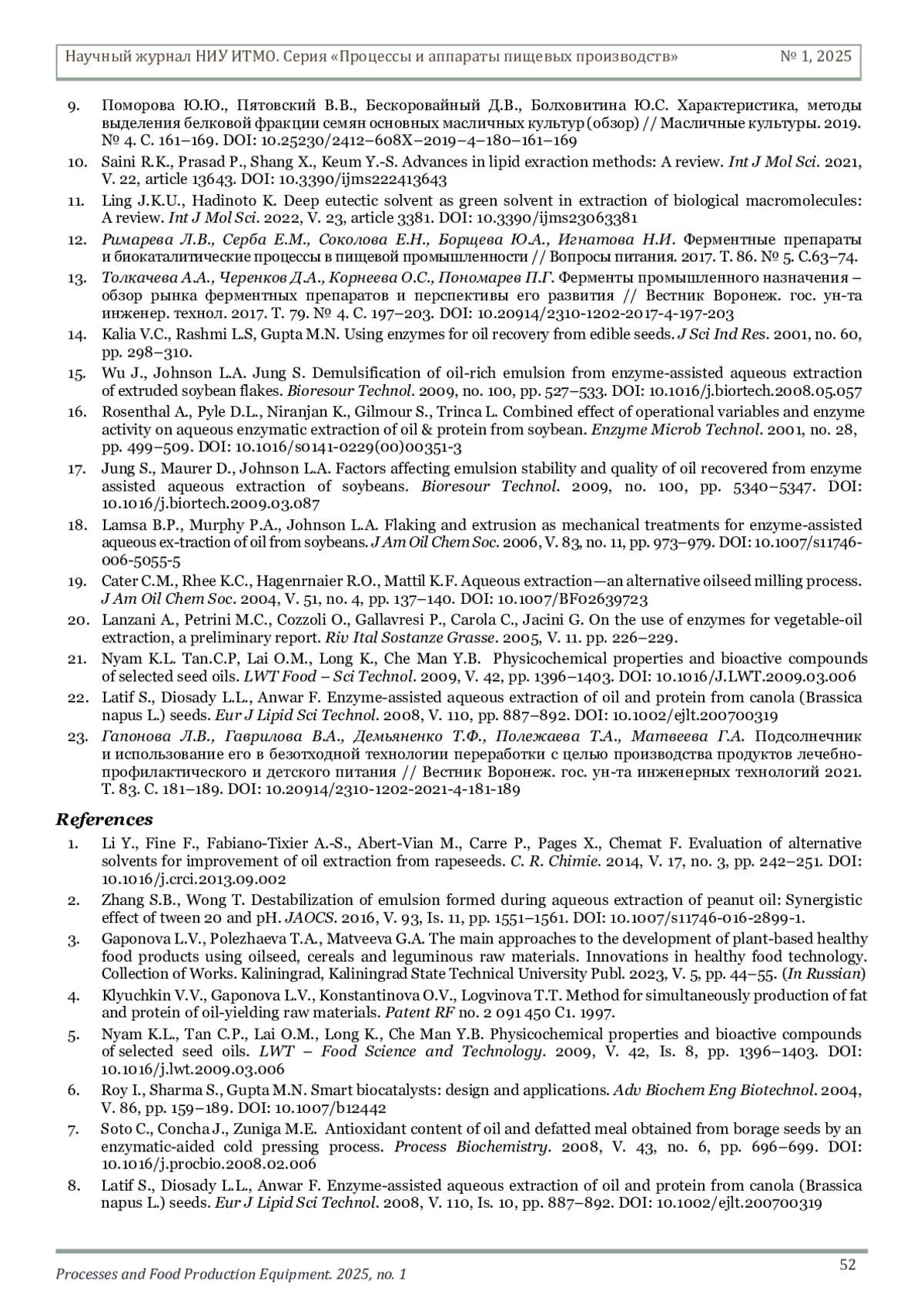 8. 	Latif S., Diosady L.L., Anwar F. Enzyme-assisted aqueous extraction of oil and protein from canola (Brassica napus L.) seeds. Eur J Lipid Sci Technol. 2008, V. 110, Is. 10, pp. 887-892. DOI: 10.1002/ejlt.200700319