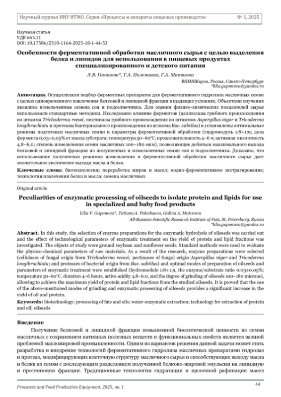 Получение белковой и липидной фракции повышенной биологической ценности из семян масличных с сохранением нативных полезных веществ и функциональных свойств является важной проблемой масложировой промышленности. Одним из вариантов решения данной задачи может стать разработка и внедрение технологий ферментативного гидролиза масличных препаратами гидролаз и протеаз, модифицирующих клеточную структуру масличного сырья и способствующих выходу масла и белка из семян с последующим разделением полученной белково-жировой эмульсии на липидную и протеиновую фракции.