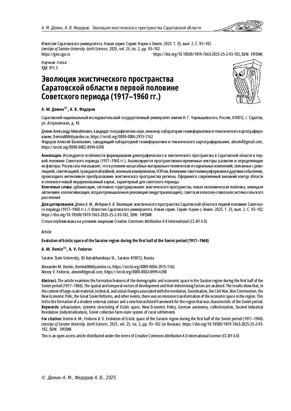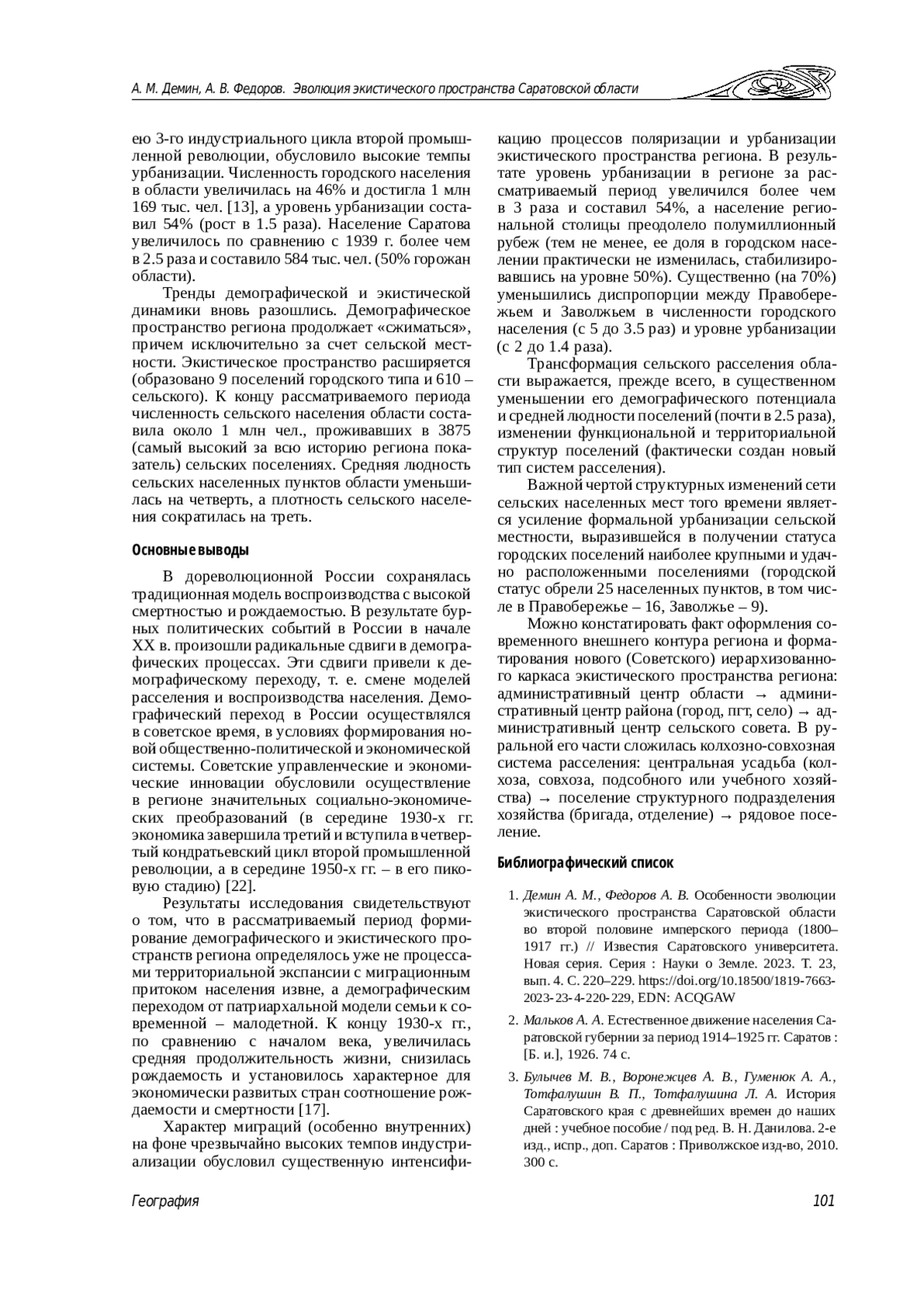 1. Демин А. М., Федоров А. В. Особенности эволюции экистического пространства Саратовской области во второй половине имперского периода (1800- 1917 гг.) // Известия Саратовского университета. Новая серия. Серия: Науки о Земле. 2023. Т. 23, вып. 4. С. 220-229. ,. DOI: 10.18500/1819-7663-2023-23-4-220-229 EDN: ACQGAW