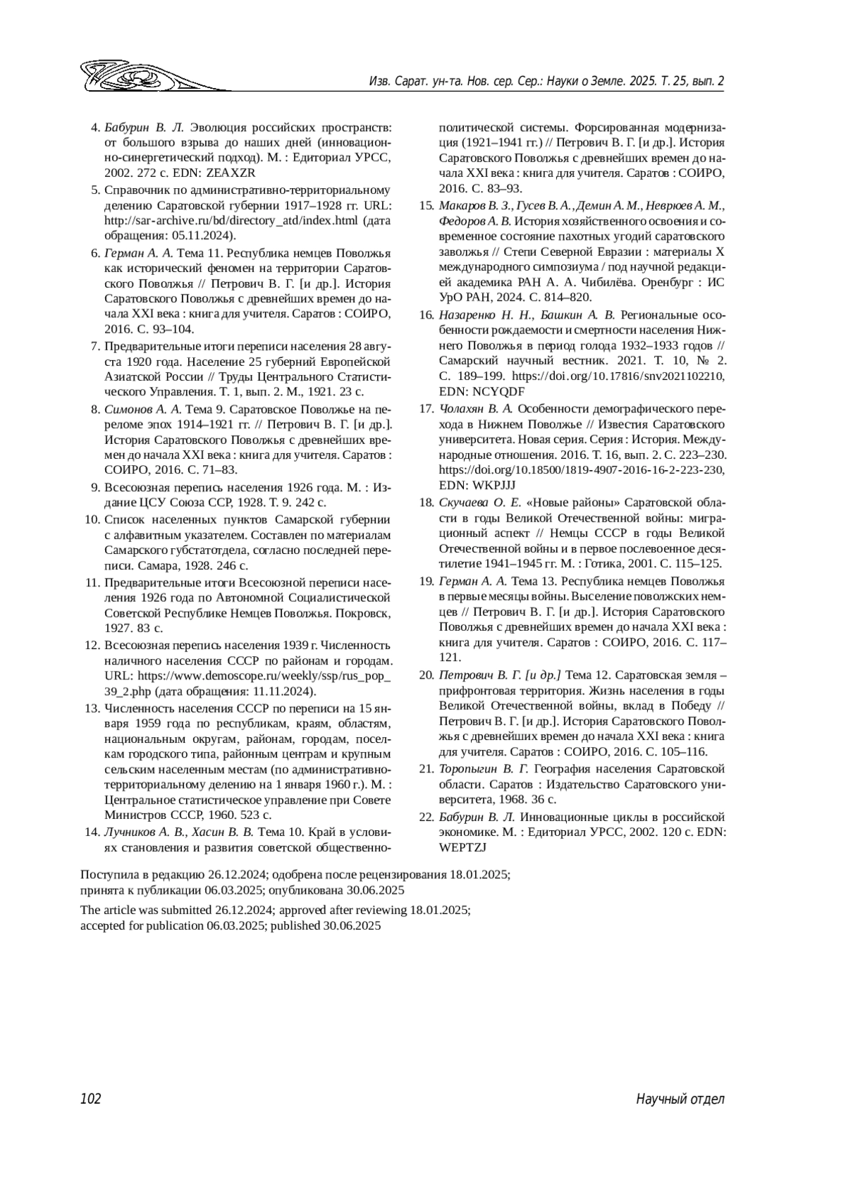 17. Чолахян В. А. Особенности демографического перехода в Нижнем Поволжье // Известия Саратовского университета. Новая серия. Серия: История. Международные отношения. 2016. Т. 16, вып. 2. С. 223-230. ,. DOI: 10.18500/1819-4907-2016-16-2-223-230 EDN: WKPJJJ
