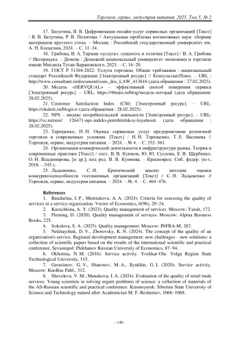 1. Бандурина, И. П. Критерии оценки качества услуг в сервисной организации [Текст] / И. П. Бандурина, А. А. Меретукова // Вектор экономики. – 2024. – № 6(96). – С. 20–24.