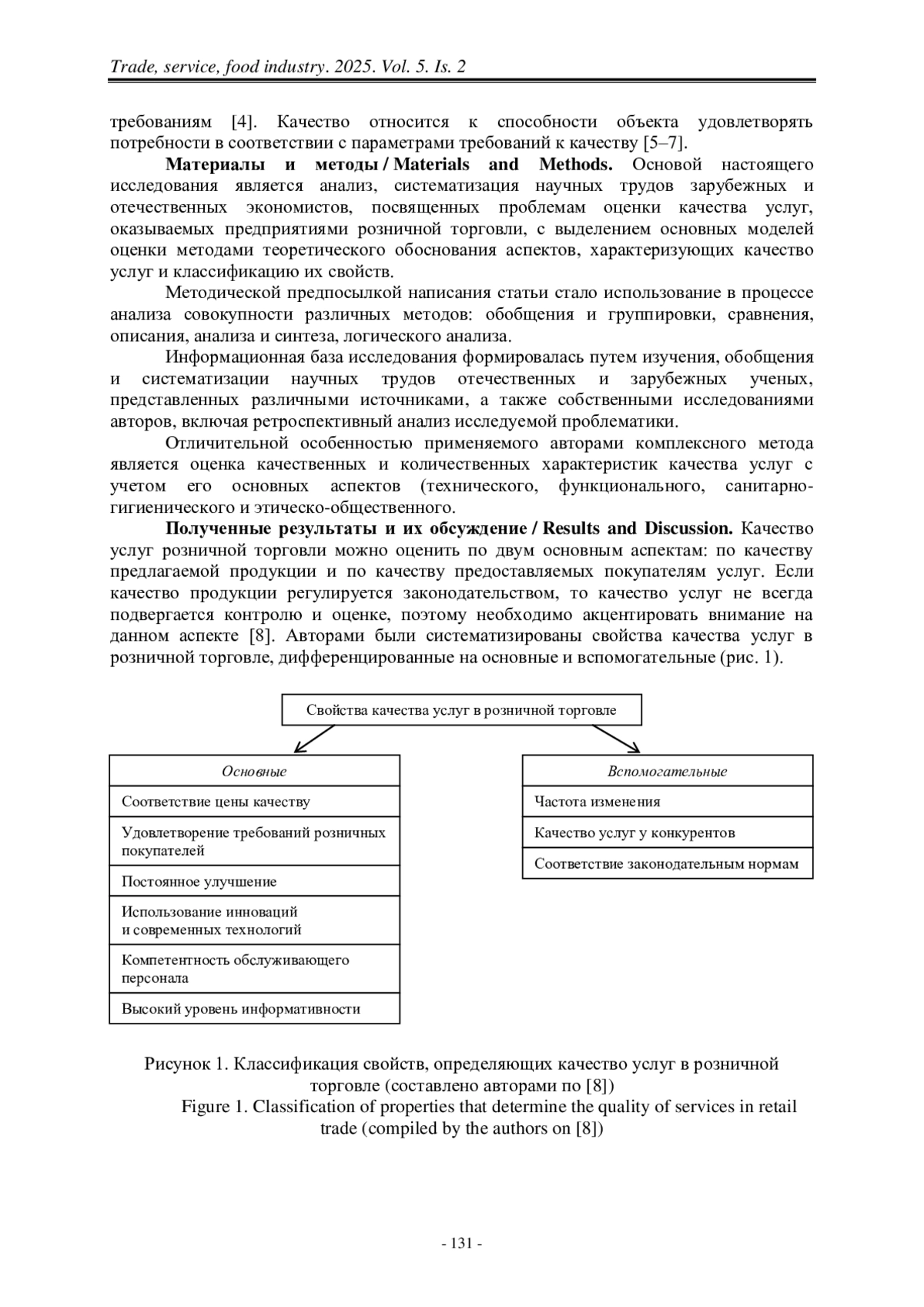 Представленная статья посвящена актуальной проблеме оценки и систематизации свойств, формирующих качество услуг в сфере розничной торговли. В работе проводится критический анализ существующих научных подходов к определению понятия и сущности качества услуг, с акцентом на специфику розничной торговли. Автор систематизирует различные свойства качества услуг этой сферы, выделяя основные и вспомогательные, и предлагает структурированный подход к оценке, учитывающий многоаспектность этого понятия.