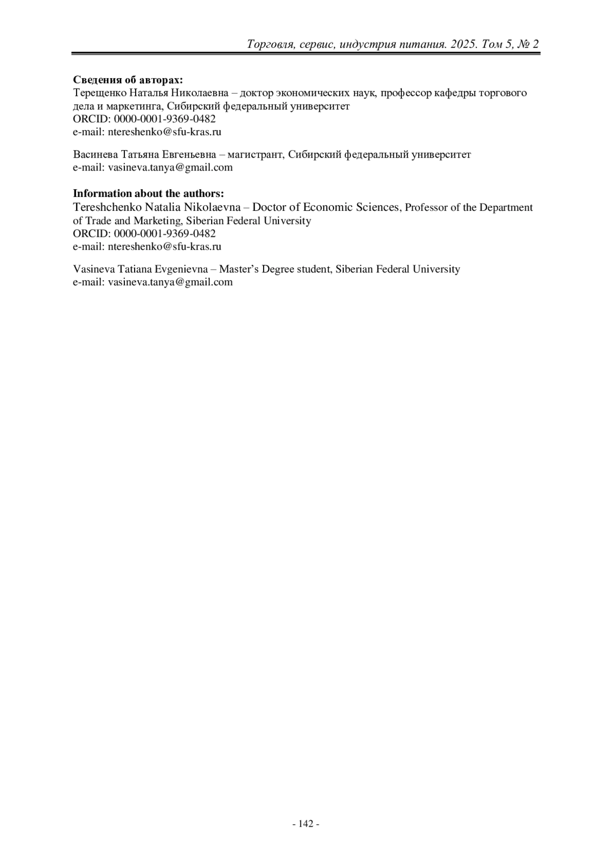 23. Терещенко, Н. Н. Оценка сервисных услуг предприятиями розничной торговли в современных условиях [Текст] / Н. Н. Терещенко, Т. Е. Васинева // Торговля, сервис, индустрия питания. – 2024. – № 4. – С. 352–361.