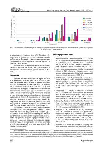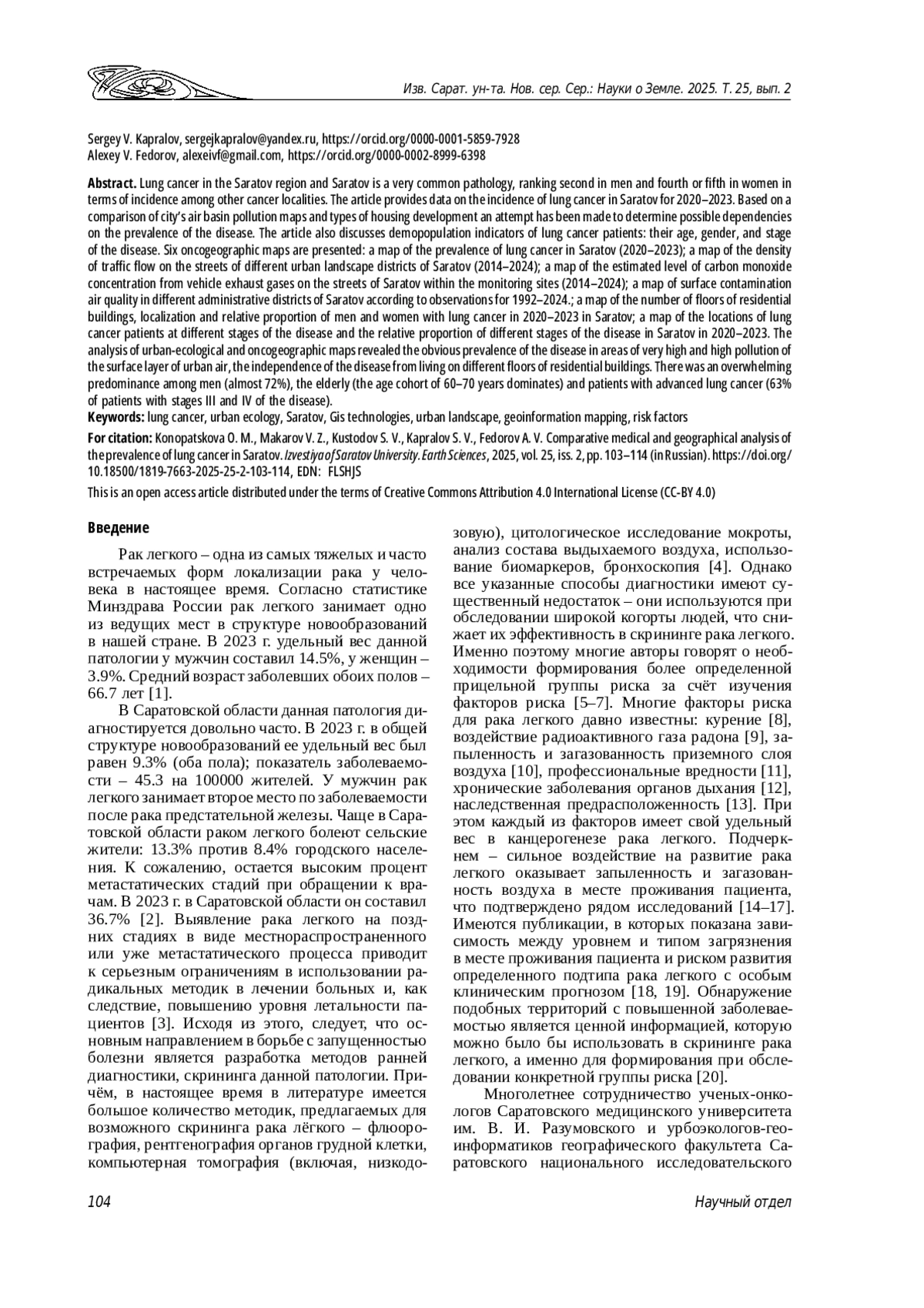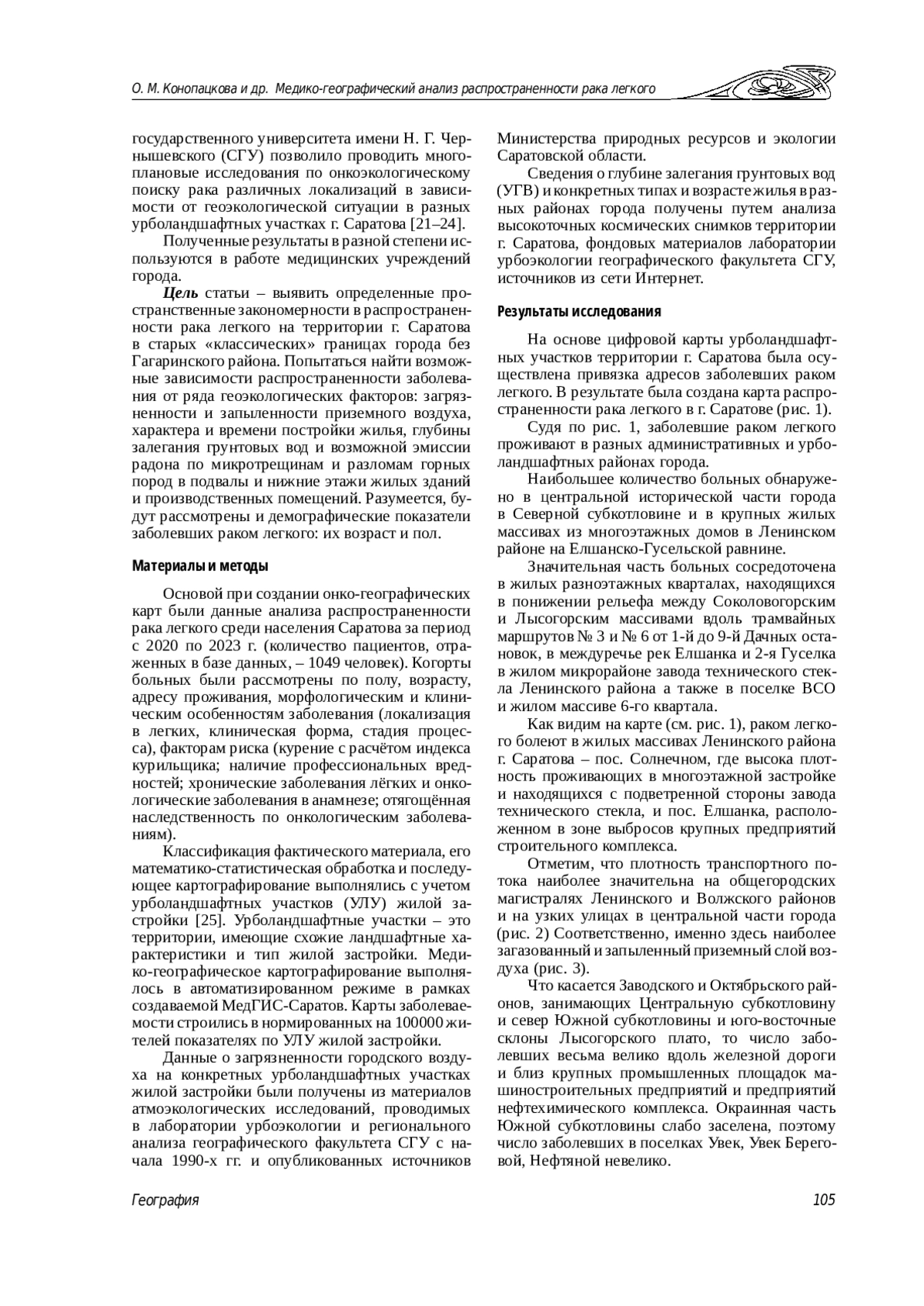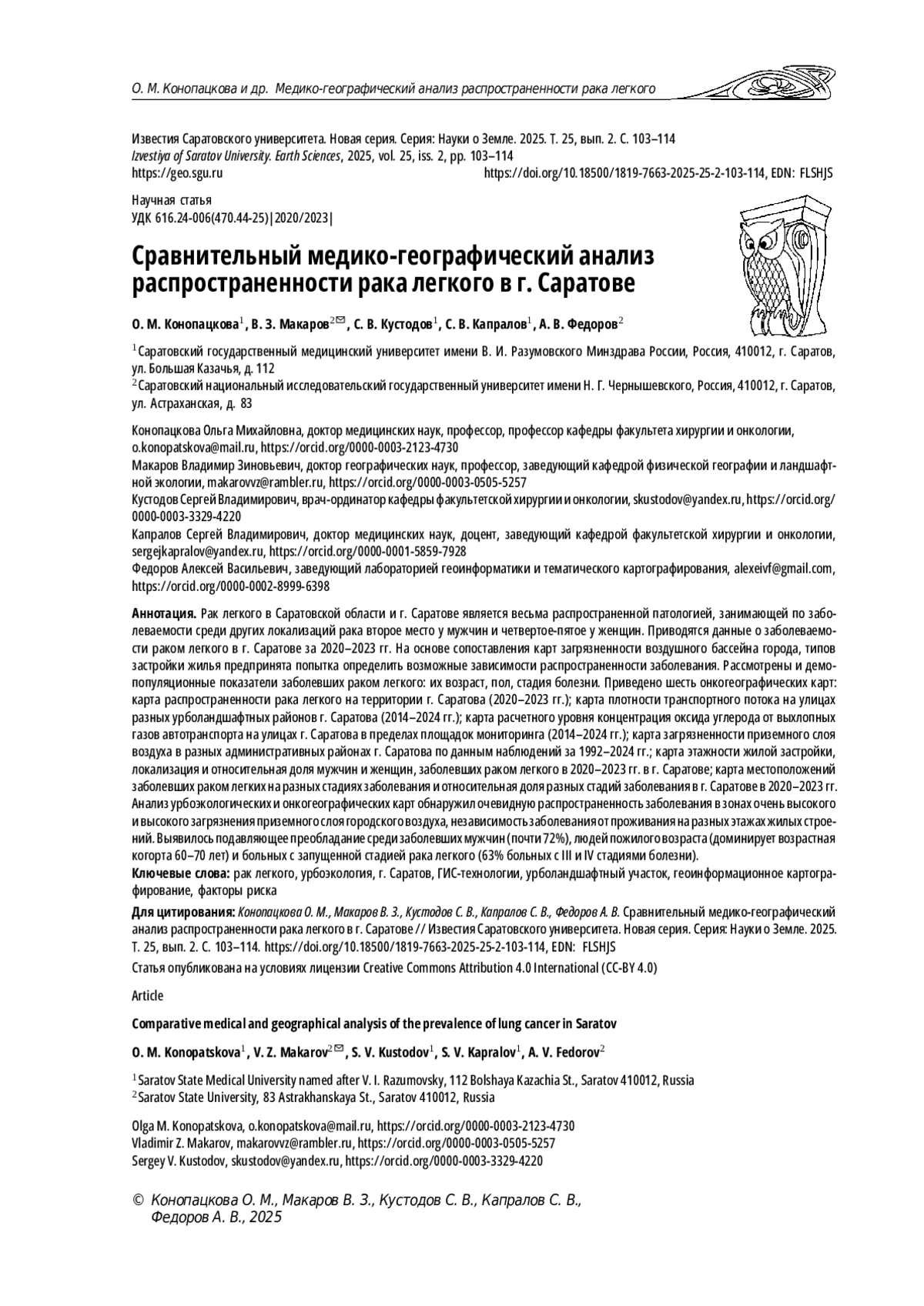 Рак легкого в Саратовской области и г. Саратове является весьма распространенной патологией, занимающей по заболеваемости среди других локализаций рака второе место у мужчин и четвертое-пятое у женщин. Приводятся данные о заболеваемости раком легкого в г. Саратове за 2020–2023 гг. На основе сопоставления карт загрязненности воздушного бассейна города, типов застройки жилья предпринята попытка определить возможные зависимости распространенности заболевания. Рассмотрены и демопопуляционные показатели заболевших раком легкого: их возраст, пол, стадия болезни. Приведено шесть онкогеографических карт: карта распространенности рака легкого на территории г. Саратова (2020–2023 гг.); карта плотности транспортного потока на улицах разных урболандшафтных районов г. Саратова (2014–2024 гг.); карта расчетного уровня концентрация оксида углерода от выхлопных газов автотранспорта на улицах г. Саратова в пределах площадок мониторинга (2014–2024 гг.); карта загрязненности приземного слоя воздуха в разных административных районах г. Саратова по данным наблюдений за 1992–2024 гг.; карта этажности жилой застройки, локализация и относительная доля мужчин и женщин, заболевших раком легкого в 2020–2023 гг. в г. Саратове; карта местоположений заболевших раком легких на разных стадиях заболевания и относительная доля разных стадий заболевания в г. Саратове в 2020–2023 гг. Анализ урбоэкологических и онкогеографических карт обнаружил очевидную распространенность заболевания в зонах очень высокого и высокого загрязнения приземного слоя городского воздуха, независимость заболевания от проживания на разных этажах жилых строений. Выявилось подавляющее преобладание среди заболевших мужчин(почти 72%), людей пожилого возраста(доминирует возрастная когорта 60–70 лет) и больных с запущенной стадией рака легкого (63% больных с III и IV стадиями болезни).