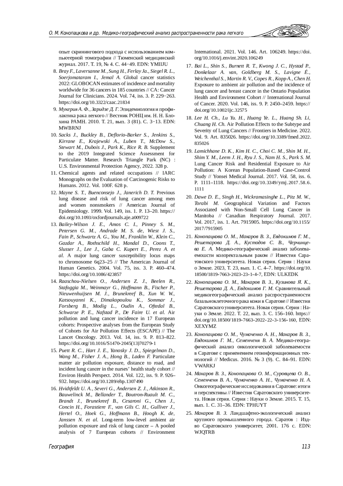 21. Конопацкова О. М., Макаров В. З., Евдокимов Г. М., Решетарова Д. А., Кустодов С. В., Черчинцева Е. А. Медико-географический анализ заболеваемошсти колоректальным раком // Известия Саратовского университета. Новая серия. Серия: Науки о Земле. 2023, Т. 23, вып. 1. С. 4-7. ,. DOI: 10.18500/1819-7663-2023-23-1-4-7 EDN: ULKEDK