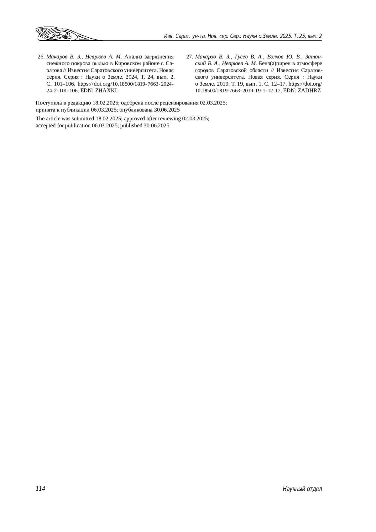 26. Макаров В. З., Неврюев А. М. Анализ загрязнения снежного покрова пылью в Кировском районе г. Саратова // Известия Саратовского университета. Новая серия. Серия: Науки о Земле. 2024, Т. 24, вып. 2. С. 101-106. ,. DOI: 10.18500/1819-7663-2024-24-2-101-106 EDN: ZHAXKL