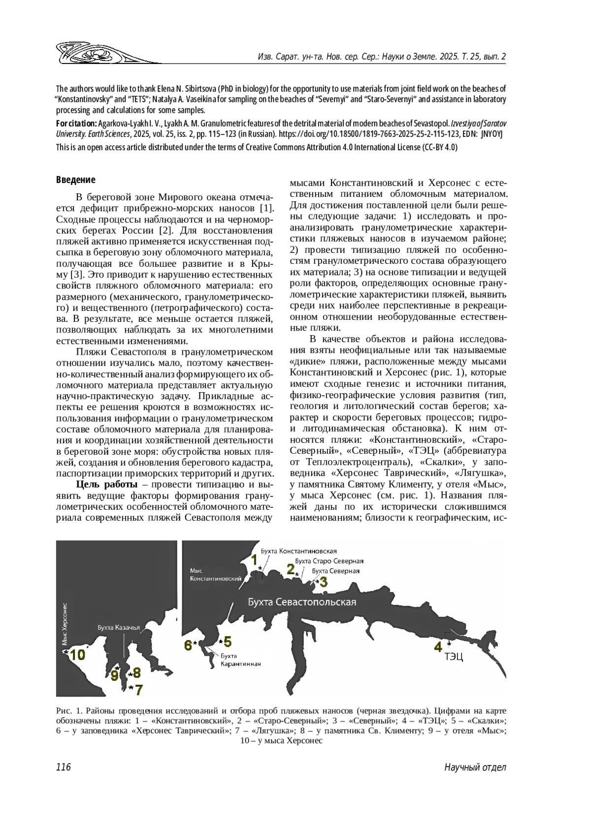 В береговой зоне Мирового океана отмечается дефицит прибрежно-морских наносов [1]. Сходные процессы наблюдаются и на черноморских берегах России [2]. Для восстановления пляжей активно применяется искусственная подсыпка в береговую зону обломочного материала, получающая все большее развитие и в Крыму [3]. Это приводит к нарушению естественных свойств пляжного обломочного материала: его размерного (механического, гранулометрического) и вещественного (петрографического) состава. В результате, все меньше остается пляжей, позволяющих наблюдать за их многолетними естественными изменениями.