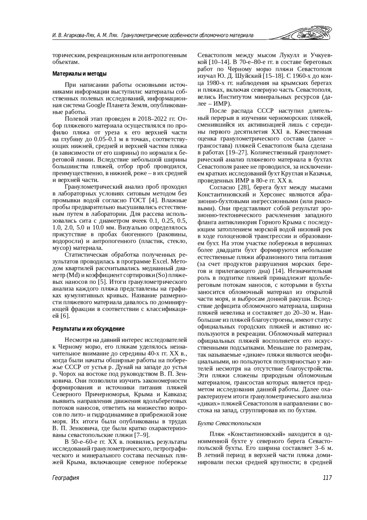 27. Агаркова-Лях И. В. Анализ гранулометрического состава пляжей Севастополя // Системы контроля окружающей среды-2019: тезисы докладов Международной научно-технической конференции (Севастополь, 12-13 сентября 2019 г.). Севастополь: Институт природно-технических систем, 2019. С. 83. EDN: KEEQDX