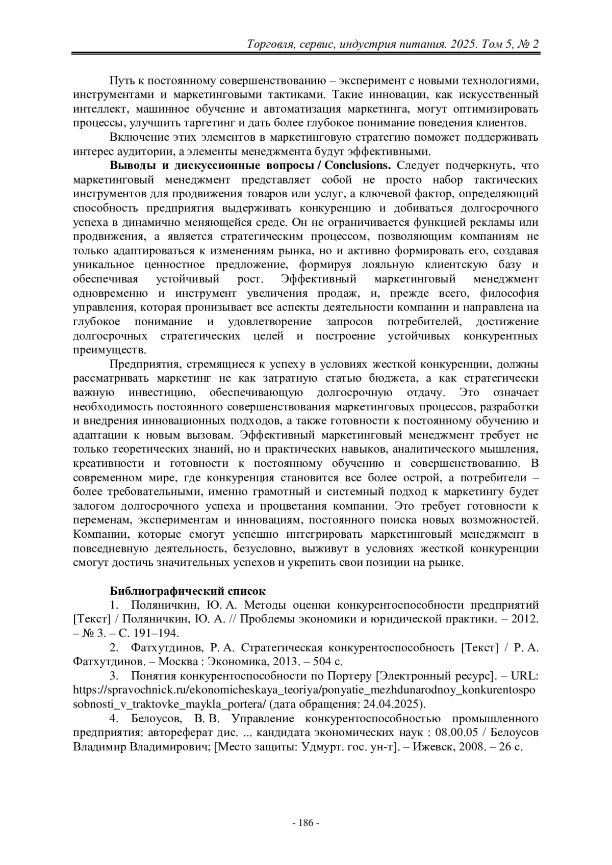 В данной статье исследуется роль маркетингового менеджмента как детерминанты конкурентоспособности предприятия. Проводится анализ ключевых аспектов управленческих воздействий в сфере маркетинга, оказывающих влияние на формирование конкурентных преимуществ. Результаты исследования свидетельствуют о том, что эффективное управление маркетинговой деятельностью является необходимым условием успешного функционирования и устойчивого развития предприятия в современных условиях цифровизации. В работе представлено авторское видение понятия «конкурентоспособность предприятия», а также предложены маркетинговые практики для стратегического развития компании в секторе малого бизнеса с целью увеличения доли рынка с учетом цифровых технологий.